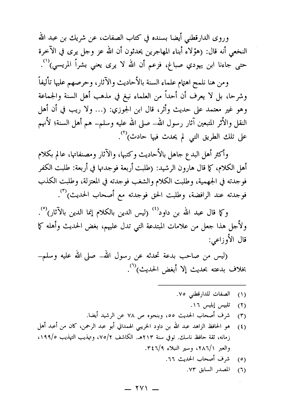 وروى الدارقطني أيضاً بسنده في كتاب الصفات، عن شريك بن عبد الله النخعي أنه قال: (هؤلاء أبناء المهاجرين يحدثون أن الله عز وجل يرى في الآخرة حتى جاءنا ابن يهودي صباغ، فزعم أن الله لا يرى يعني بشراً المريسي) .