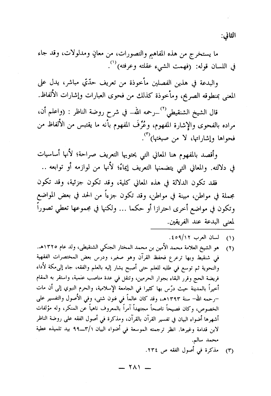 والبدعة في هذين الفصلين مأخوذة من تعريف حدي مباشر، يدل على المعنى بمنطوقه الصريح، ومأخوذة كذلك من فحوى العبارات وإشارات الألفاظ.