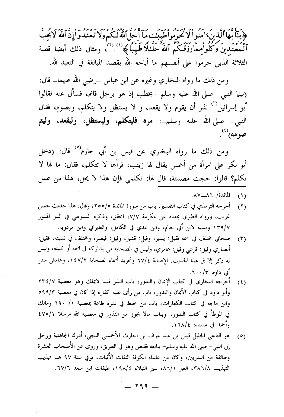 ومن ذلك ما رواه البخاري وغيره عن ابن عباس - رضي الله عنهما - قال: (بينما النبي صلى الله عليه وسلم يخطب إذ هو برجل قائم، فسأل عنه فقالوا أبو سرائيل نذر أن يقوم ولا يقعد، ولا يستظل ولا يتكلم، ويصوم، فقال النبي صلى الله عليه وسلم: مروه فليتكلم، وليستظل، وليقعد، وليتم صومه) .