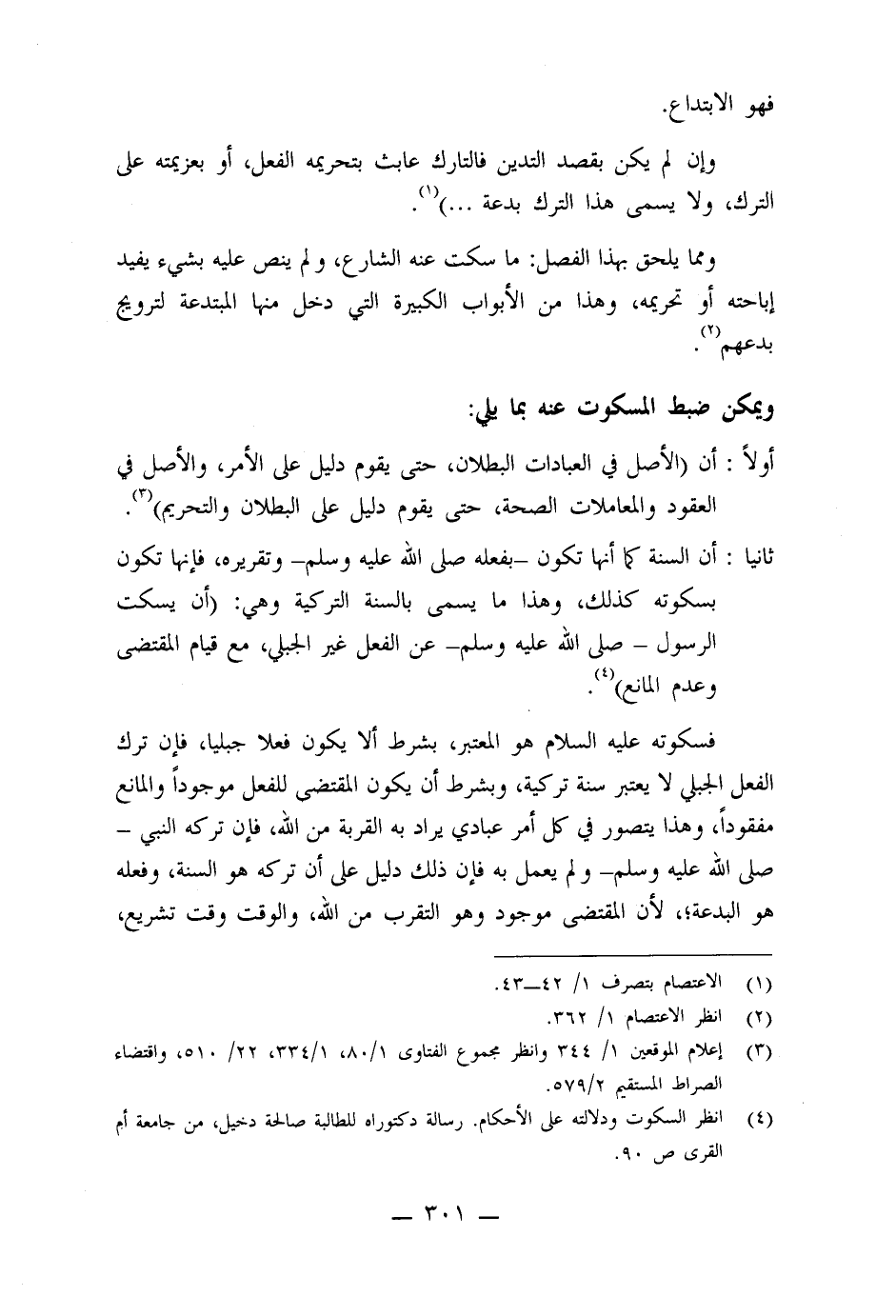 فسكوته عليه الصلاة والسلام هو المعتبر بشرط ألا يكون فعلا ًجبليا ً، فإن ترك الفعل الجبلي لا يعتبر سنة تركية، وبشرط أن يكون المقتضي للفعل موجودا ً والمانع مفقودا ً، وهذا يتصور في كل أمر عبادي يراد به القربة من الله تعالى، فإن تركه النبي صلى الله عليه وسلم ولم يعمل به فإن ذلك دليل ٌ على أن تركه هو السنة، وفعله هو البدعة؛ لأن المقتضي موجود وهو التقرب من الله، والوقت وقت تشريع،