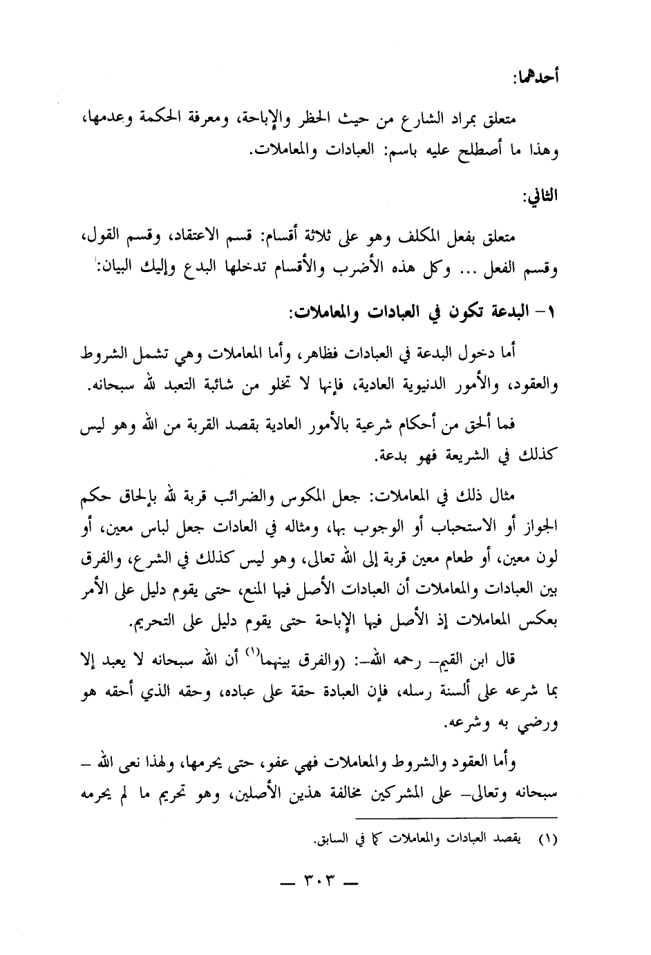 متعلق بمراد الشارع من حيث الحظر والإباحة، ومعرفة الحكم وعدمها، وهذا ما أصطلح عليه باسم: العبادات والمعاملات.