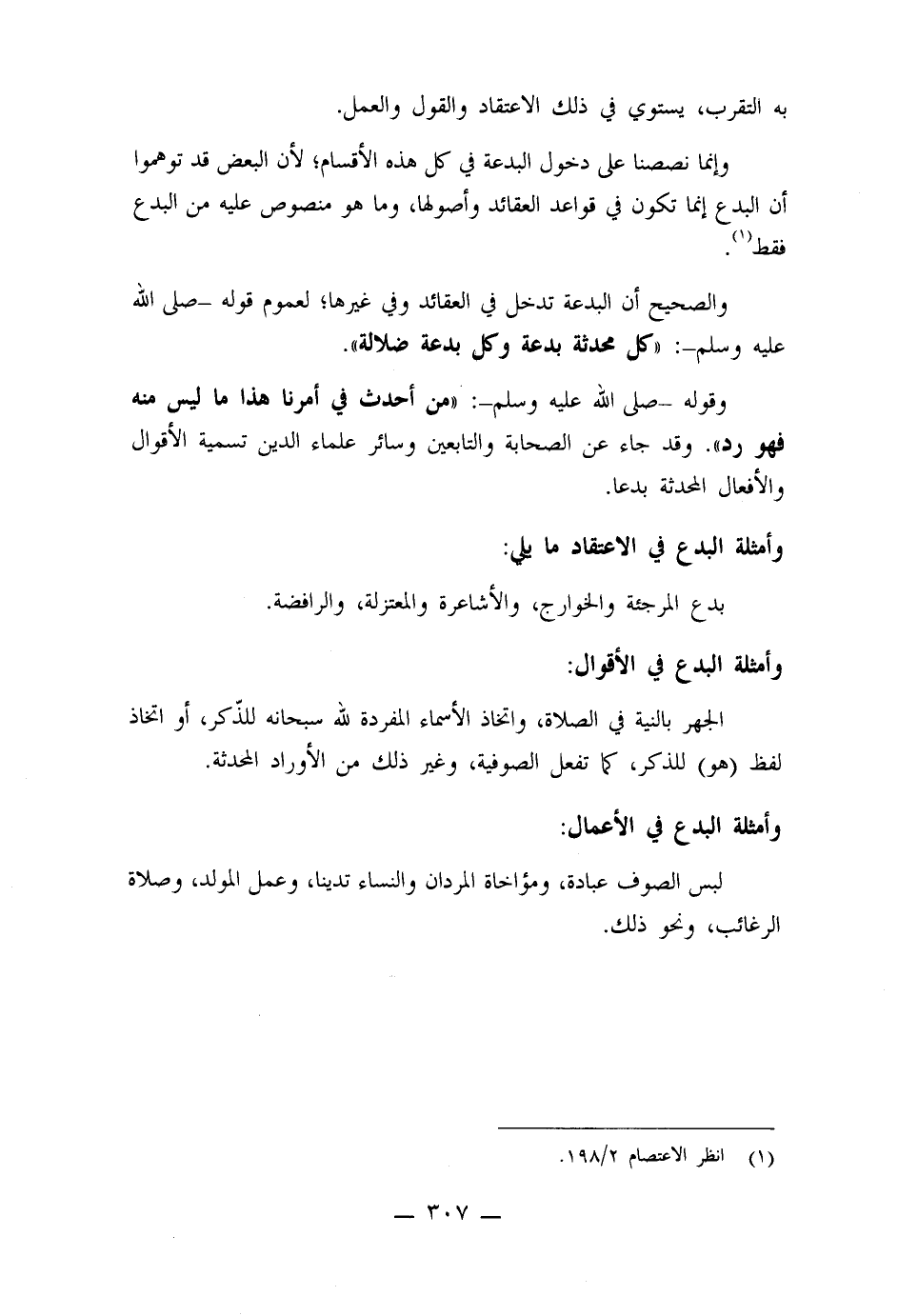 وإنما نصصنا على دخول البدعة في كل هذه الأقسام، لأن البعض قد توهموا أن البدع إنما تكون في قواعد العقائد وأصولها، وما هو منصوص عليه من البدع فقط.