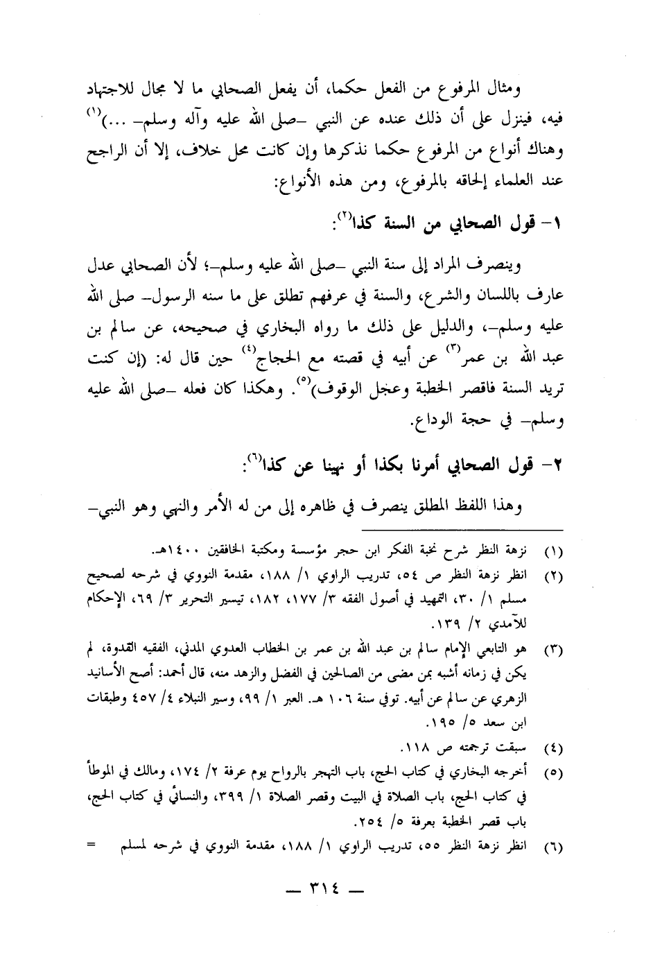 وينصرف المراد إلى سنة النبي - صلى الله عليه وسلم -؛ لأن الصحابي عدل عارف باللسان والشرع، والسنة في عرفهم تطلق على ما سنة الرسول - صلى الله عليه وسلم -، والدليل على ذلك ما رواه البخاري في صحيحة عن سالم بن عبد الله بن عمر عن أبيه في قصته مع الحجاج حين قال له: (إن كنت تريد السنة فاقصر الخطبة وعجل الوقوف) ، وهكذا كان فعله - صلى الله عليه وسلم - في حجة الوداع.