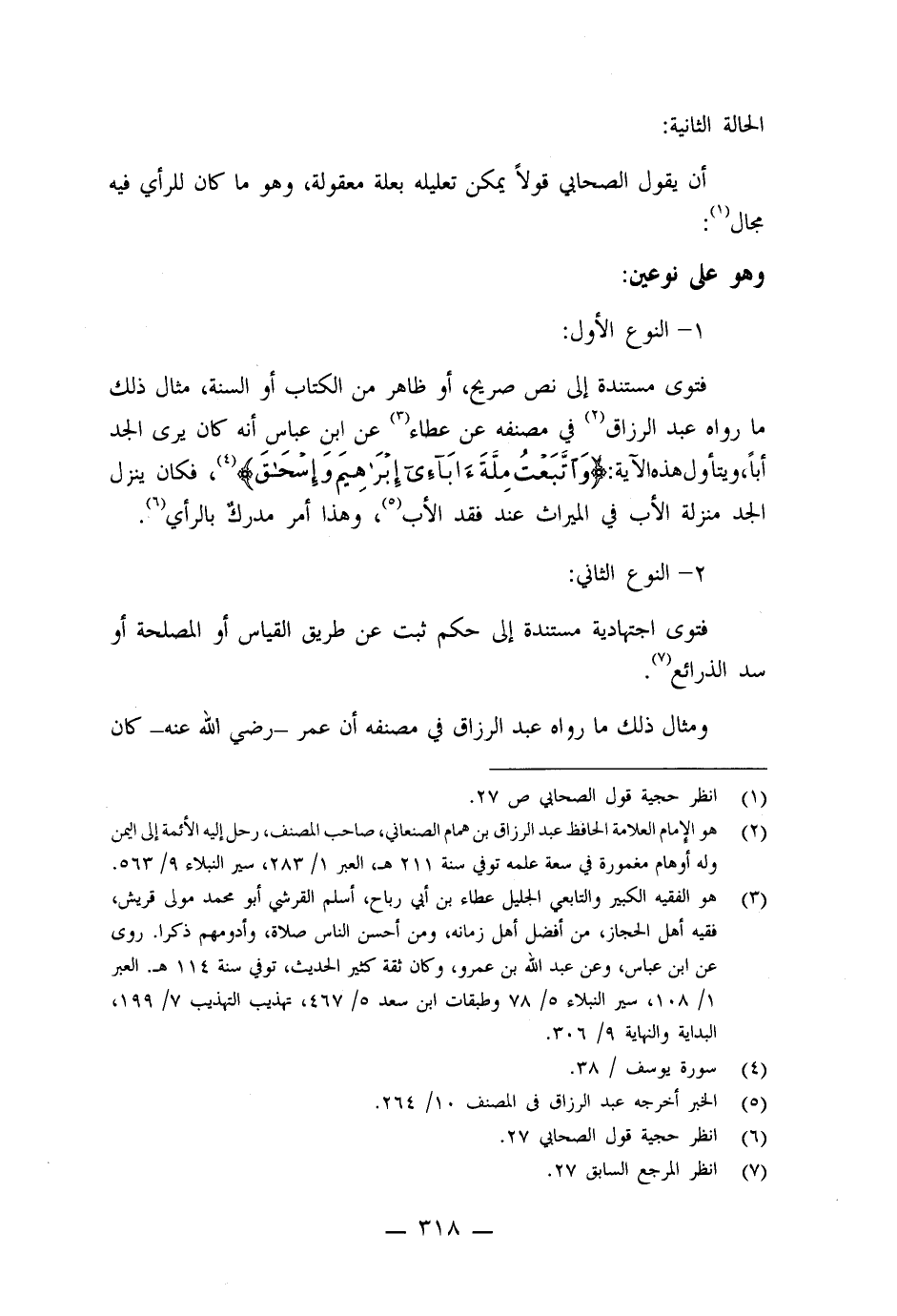 فتوى مستندة إلى نص صريح، أو ظاهر من الكتاب أو السنة، مثال ذلك ما رواه عبد الرزاق في مصنفه عن عطاء عن ابن عباس أنه كان يرى الجد أباً، ويتأول هذه الآية: [واتبعت ملة آبائي إبراهيم وإسحاق] ، فان ينزل الجد منزلة الأب في الميراث عند فقد الأب، وهذا أمر مدرك بالرأي.