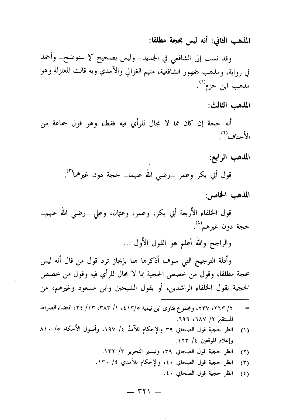وأدلة الترجيح التي سوف أذكرها هنا بإيجاز ترد قول من قال أنه ليس بحجة مطلقاً، وقول من خصص الحجية بما لا مجال للرأي فيه وقول من خصص الحجية بقول الخلفاء الراشدين، أو بقول الشيخين وابن مسعود وغيرهم، من