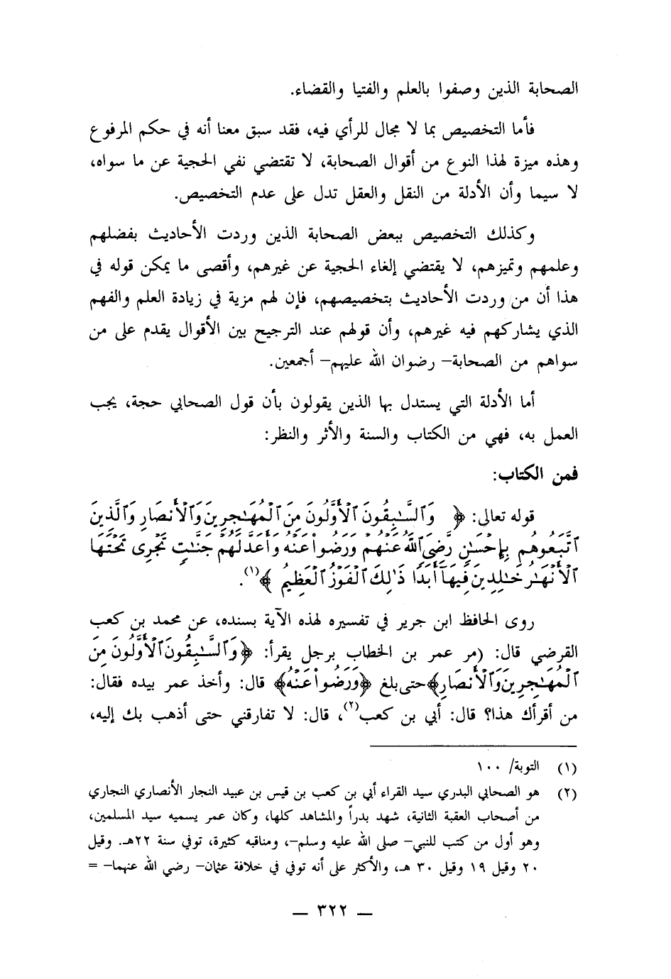 روى الحافظ ابن جرير في تفسيره لهذه الآية بسنده، عن محمد بن كعب القرضي قال: (مر عمر بن الخطاب برجل يقرأ [والسابقون الأولون من المهاجرين والأنصار] حتى بلغ [ورضوا عنه] ، قال: وأخذ عمر بيده فقال: من أقرأك هذا؟ ، قال: أبي بن كعب، قال: لا تفارقني حتى أذهب بك إليه،