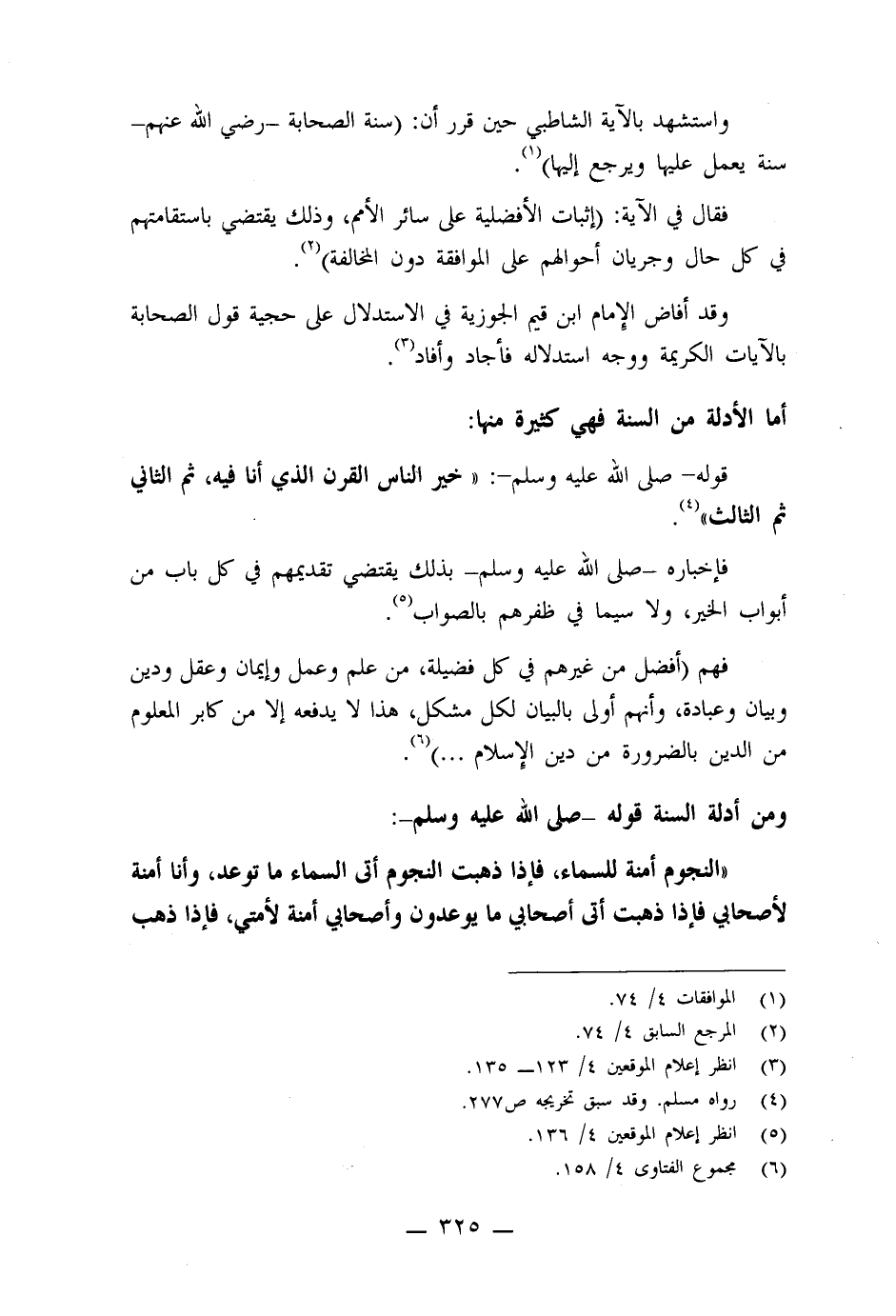 ومن أدلة السنة - صلى الله عليه وسلم -: " النجوم أمنة للسماء، فإذا ذهبت النجوم أتى السماء ما توعد، وأنا أمنة لأصحابي فإذا ذهبت أتى أصحابي ما يوعدون، وأصحابي أمنة لأمتي فإذا ذهب