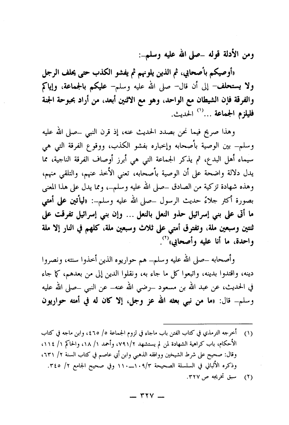 وهذا صريح فيما نحن بصدد الحديث عنه، إذ قرن النبي - صلى الله عليه وسلم - بين الوصية بأصحابه وإخباره بفشو الكذب، ووقوع الفرقة التي هي سيماء أهل البدع، ثم يذكر الجماعة التي هي أبرز أوصاف الفرقة الناجية مم ايدل دلالة واضحة على أن الوصية بأصحابه، تعني الأخذ عنهم، والتلقي منهم، وهذه شهادة تزكية من الصادق - صلى الله عليه وسلم - ومما يدل على هذا المعنى بصورة أكثر جلاءً حديث الرسول - صلى الله عليه وسلم -: " ليأتين على أمتي ما أتى على بني إسرائيل حذو النعل بالنعل ... وإن بني إسرائيل تفرقت على ثنتين وسبعين ملة، وتفترق أمتي على ثلاث وسبعين ملة، كلهم في النار إلا ملة واحدة، ما أنا عليه وأصحابي ".