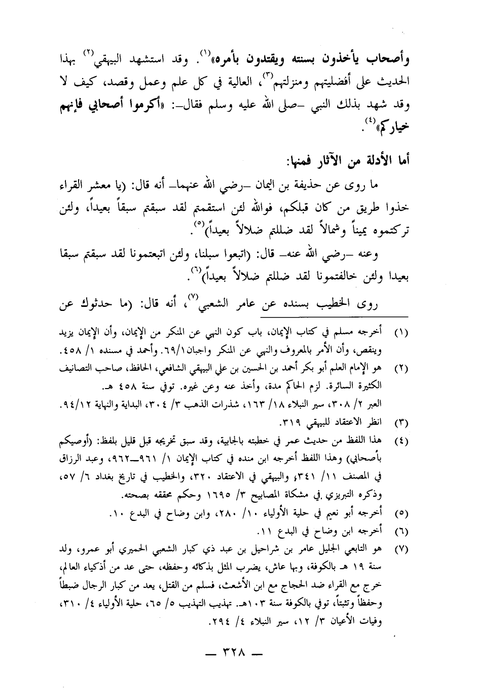 وأصحاب يأخذون بسنته ويقتدون بأمره "، وقد استشهد البيهقي بهذا الحديث على أفضليتهم ومنزلتهم العالية في كل علم وعمل وقصد كيف لا وقد شهد بذلك - صلى الله عليه وسلم - فقال: " أكرموا أصحابي فإنهم خياركم ".