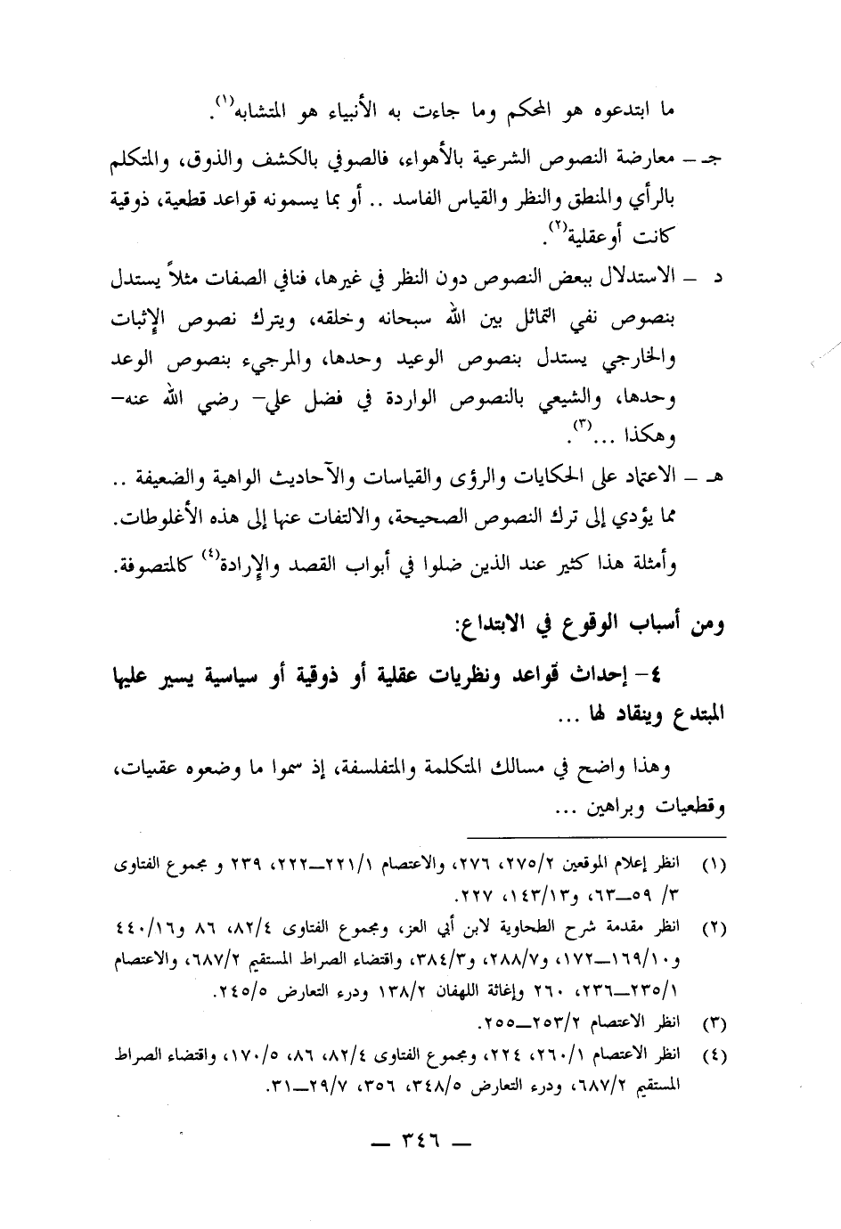 جـ. معارضة النصوص الشرعية بالأهواء فالصوفي بالكشف والذوق، والمتكلم بالرأي والمنطق والنظر والقياس الفاسد.. أو بما يسمونه قواعد قطعية ذوقية كانت أو عقلية.