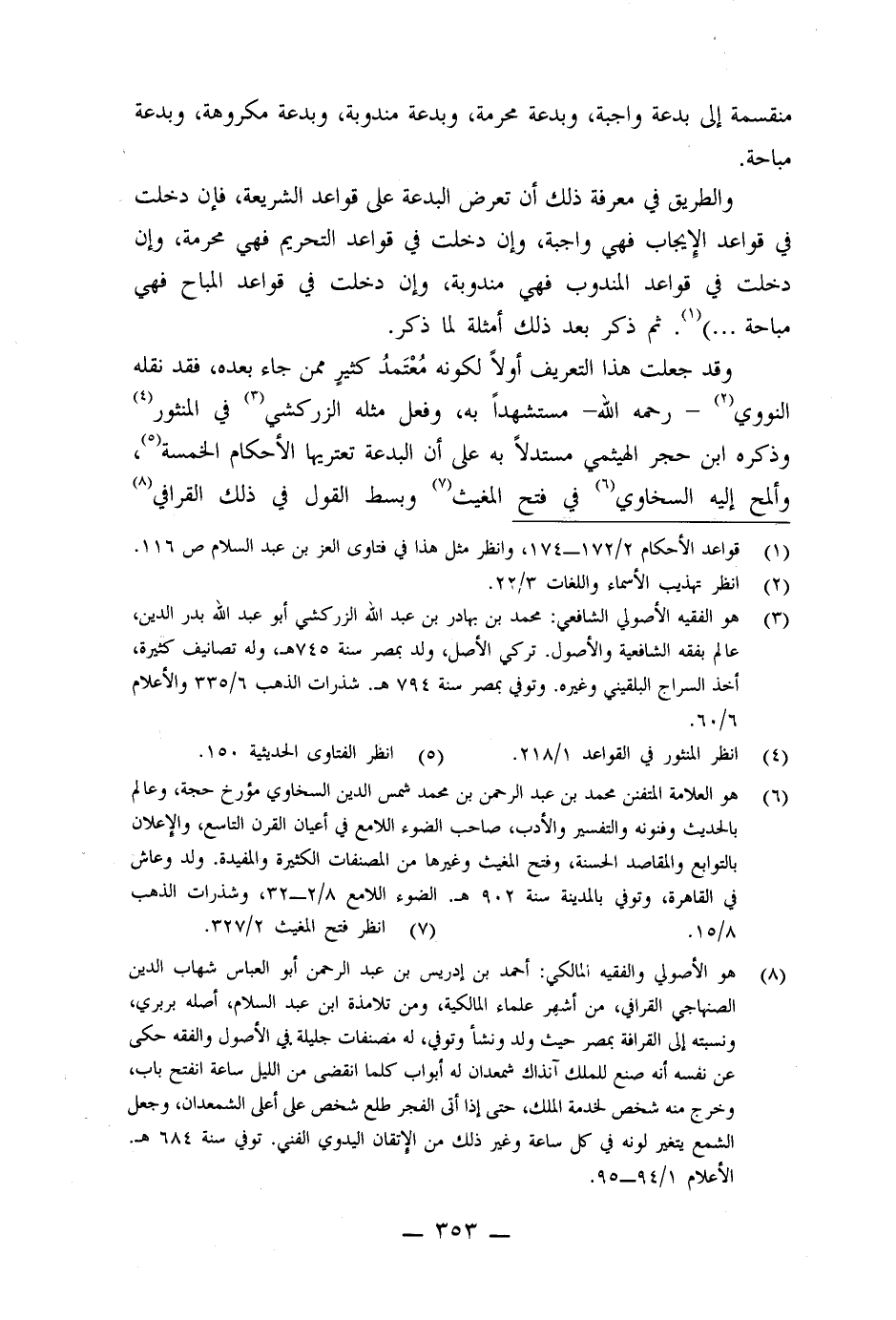 وقد جعلت هذا التعريف أولا ً لكونه مُعْتَمدُ كثير ٍ ممن جاء بعده فقد نقله النووي - رحمه الله - مستشهدا ً به، وفعل مثله الزركشي في المنثور، وذكره ابن حجر الهيتمي مستدلا ً به على أن البدعة تعتريها الأحكام الخمسة، وألمح إليه السخاوي في فتح المغيث وبسط القول في ذلك القرافي
