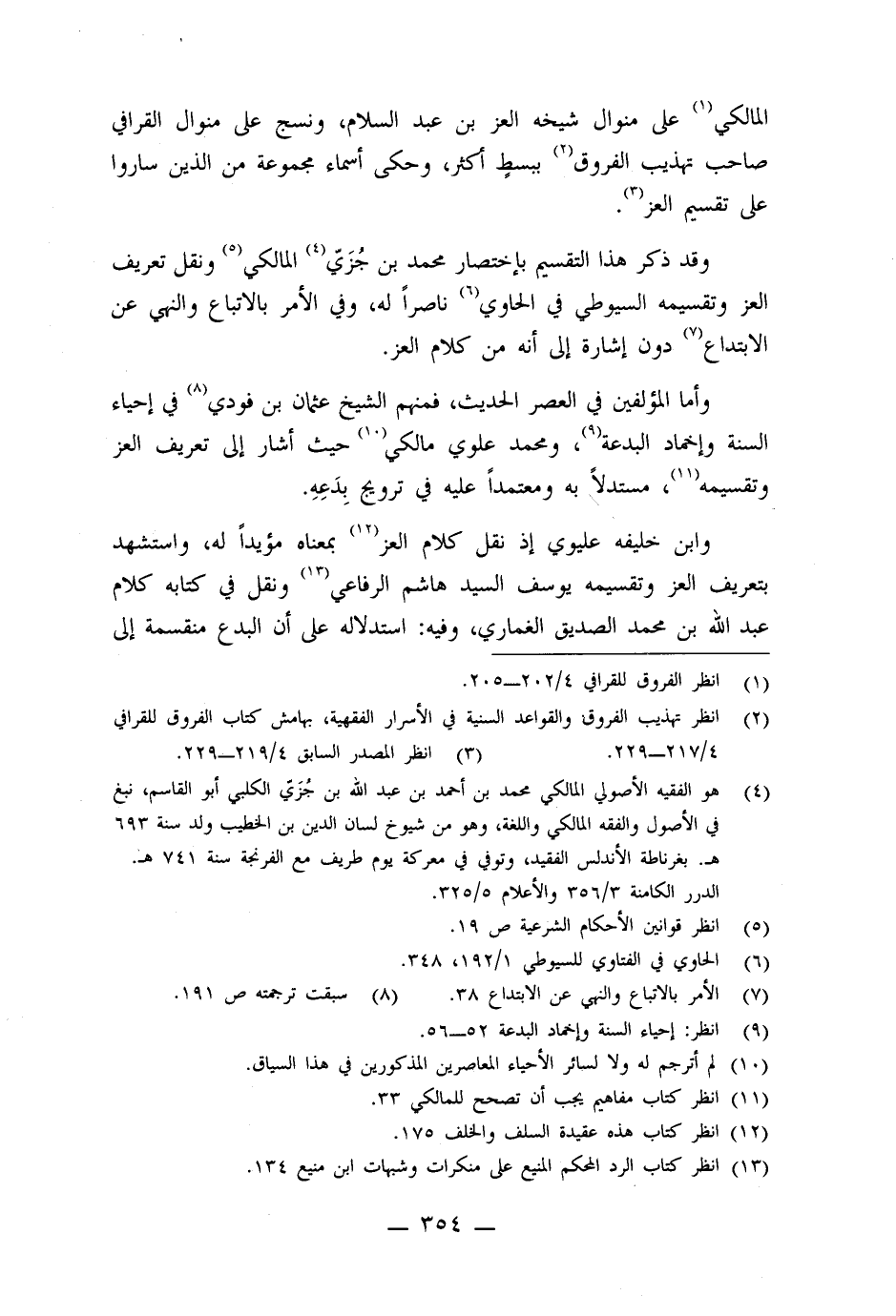 وابن خليفه عليوي إذ نقل كلام العز بمعناه مؤيدا ً له، واستشهد بتعريف العز وتقسيمه يوسف السيد هاشم الرفاعي ونقل في كتابه كلام عبد الله بن محمد الصديق الغماري، وفيه استدلاله على أن البدع منقسمة إلى