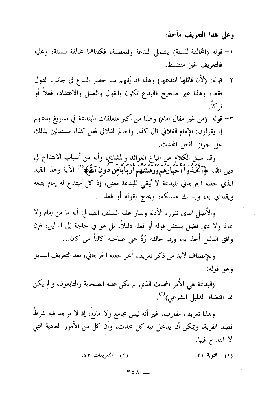 وقد سبق الكلام عن اتباع العوائد والمشايخ وأنه من أسباب الابتداع في دين الله، ((اتخذوا أحبارهم ورهبانهم أرباباً من دون الله)) الآية، وهذا القيد الذي جعله الجرجاني للبدعة لا يبقي للبدعة معنى ً، إذ كل مبتدع له إمام يتبعه ويقتدي به، ويسلك مسلكه، ويحتج بقوله أو فعله ...