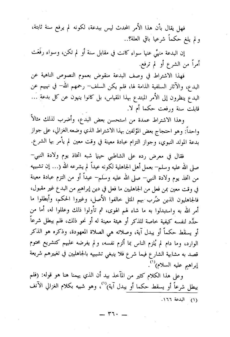 فقال في معرض رده على الشاطبي حينما شبه اتخاذ يوم ولادة النبي صلى الله عليه وسلم بعمل أهل الجاهلية لكونه عيداً لم يشرعه الله ( ... إن تشبيهه من اتخذ يوم ولادة النبي صلى الله عليه وسلم عيداً أو من التزم عبادة ً معينة ً في وقت ٍ معين ٍ بمن فعل من الجاهليين ما فعل في دين إبراهيم من البدع غير مقبول، فالجاهليون الذين ضُرب بهم المثل خالفوا الأصل، وغيروا الحكم، وأبطلوا ما أمر الله به، واستدلوا به ما شاء لهم الهوى، ثم تأولوا ذلك وعللوا له، أما من حدد لنفسه كيفية خاصة للذكر أو هيئة معينة له، أو نحو ذلك، فلم يبطل شرعاً أو يسقط حكما ً أو يبدل آية، وصلاته هي الصلاة المعهودة، وذكره هو الذكر الوارد، وما دام لم يلزم الناس بما ألزم نفسه، ولم يفرضه عليهم كتشريع محتوم قصد به مشابهة الشارع فيما شرع فلا ينبغي تشبيهه بالجاهليين في تغييرهم شريعة إبراهيم عليه السلام) .