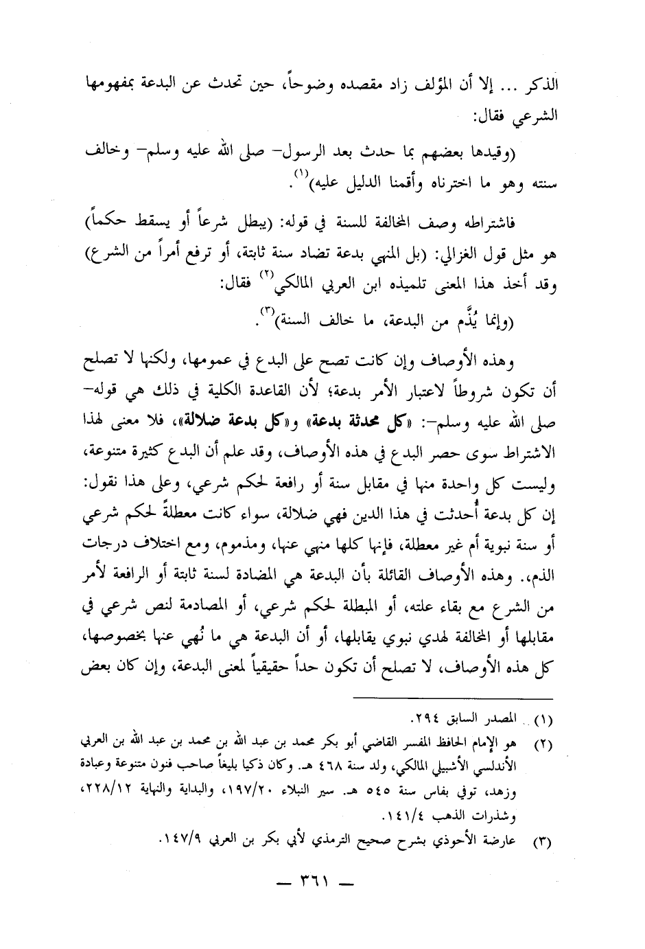 الذكر ... إلا أن المؤلف زاد مقصده وضوحاً، حين تحدث عن البدعة بمفهومها الشرعي، فقال:
