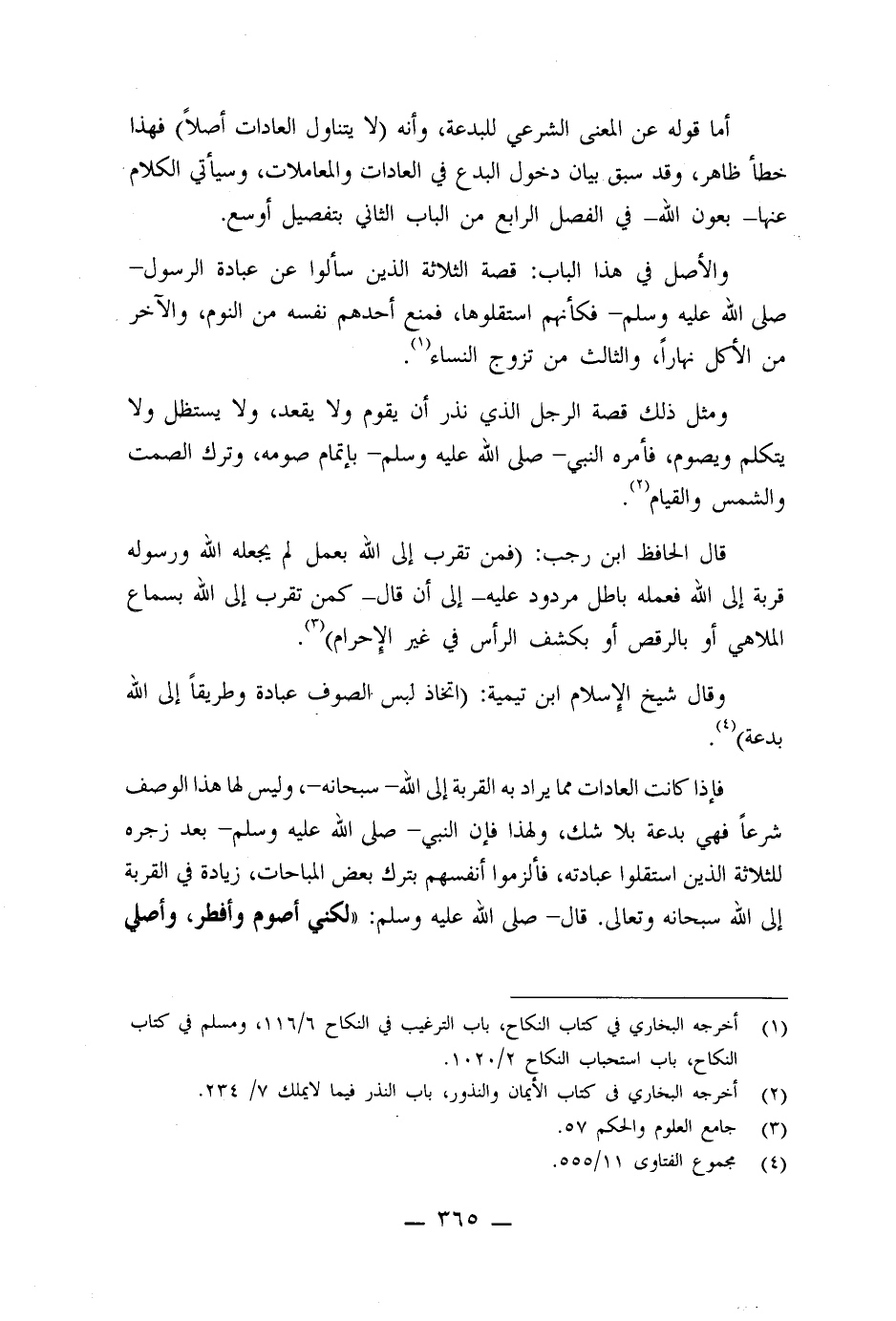 أما قوله عن المعنى الشرعي للبدعة، وأنه (لا يتناول العادات أصلا ً) فهذا خطأ ظاهر، وقد سبق بيان دخول البدع في العادات والمعاملات، وسيأتي الكلام عنها بعون الله في الفصل الرابع من الباب الثاني بتفصيل أوسع.