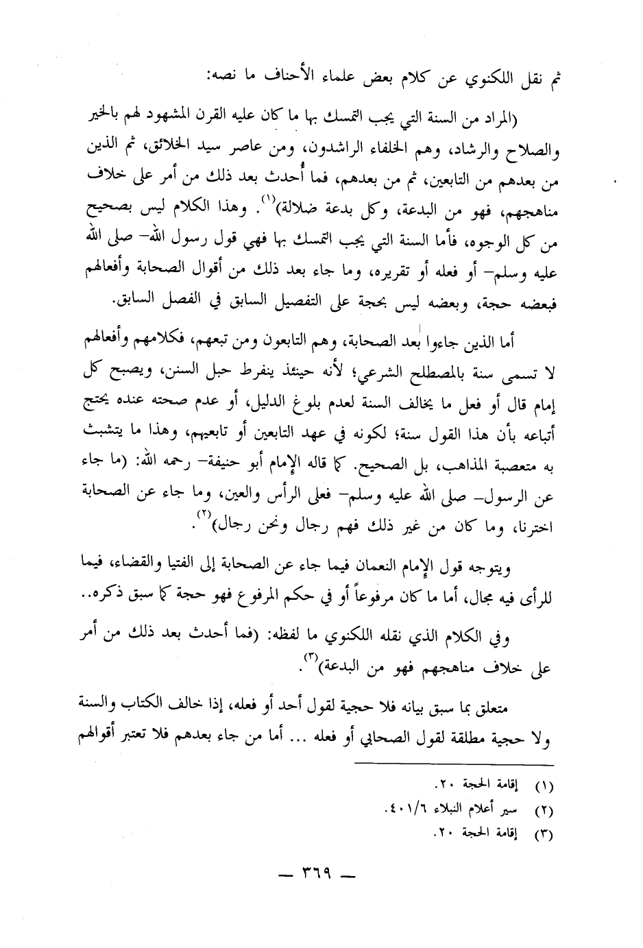 وفي الكلام الذي نقله اللكنوي ما لفظه: (فما أحدث بعد ذلك من أمر على خلاف مناهجهم فهو من البدعة) .