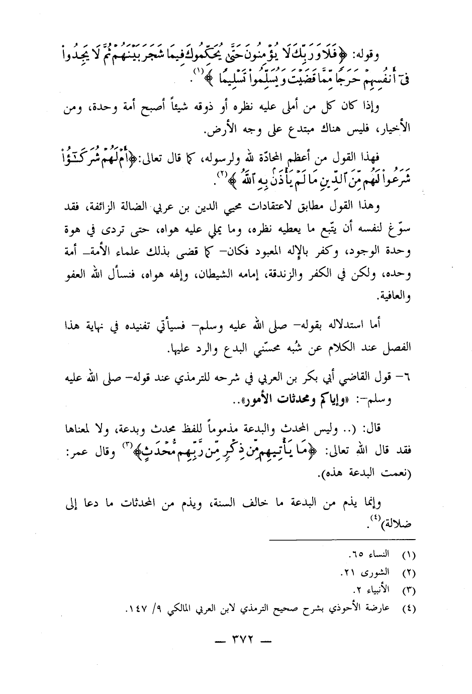 6- قول القاضي أبي بكر بن العربي في شرحه للترمذي، عند قوله صلى الله عليه وسلم: ((وإياكم ومحدثات الأمور)) :