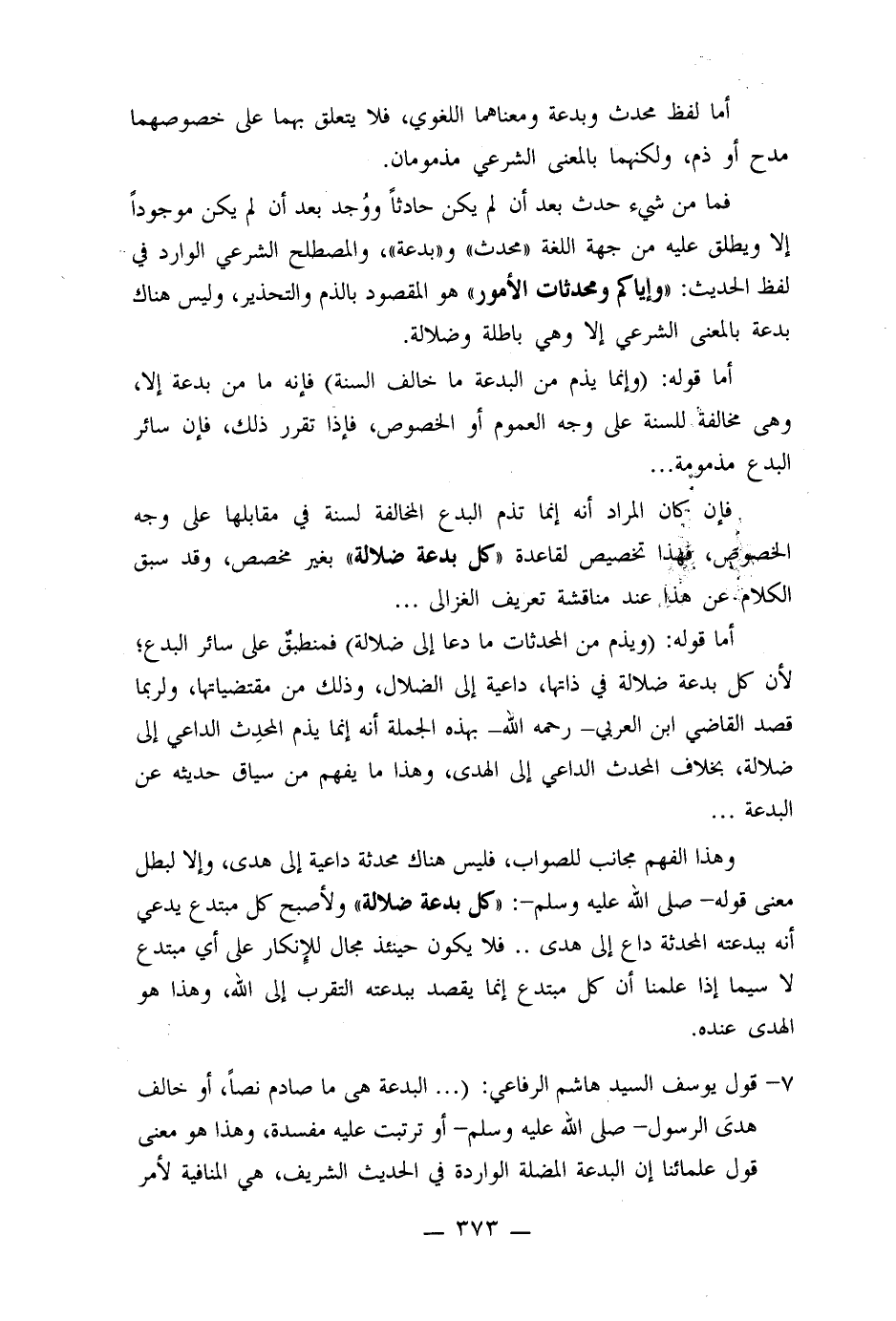 7- قول يوسف السيد هاشم الرفاعي: ( ... البدعة هي ما صادم نصا ً أو خالف هدى الرسول صلى الله عليه وسلم أو ترتب عليه مفسدة، وهذا هو معنى قول علمائنا إن البدعة المضلة الواردة في الحديث الشريف هي المنافية لأمر