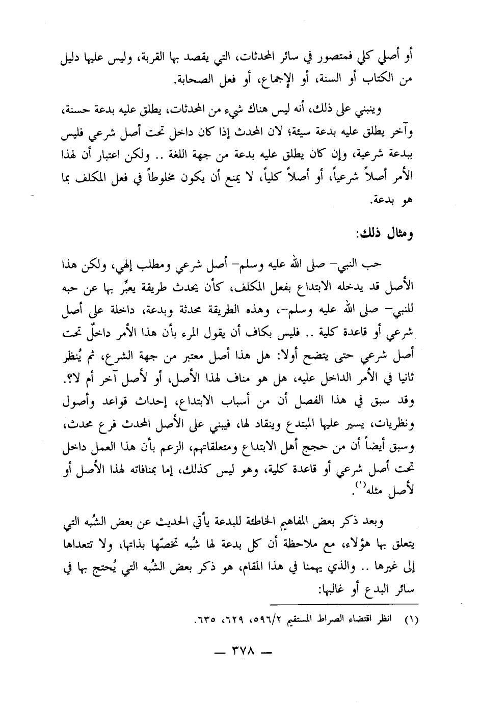 حب النبي صلى الله عليه وسلم أصل شرعي ومطلب إلهي، ولكن هذا الأصل قد يدخله الابتداع بفعل المكلف، كأن يحدث طريقة يعبر بها عن حبه للنبي صلى الله عليه وسلم، وهذه الطريقة محدثة وبدعة، داخلة على أصل شرعي أو قاعدة كلية.. فليس بكاف أن يقول المرء بأن هذا الأمر داخل ٌ تحت أصل شرعي حتى يضح أولا ً: هل هذا أصل معتبر من جهة الشرع، ثم ينظر ثانيا ً في الأمر الداخل عليه، هل هو مناف ٍ لهذا الأصل، أو لأصل ٍ آخر أم لا؟ .