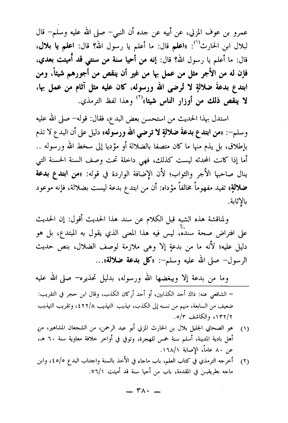 ولمناقشة هذه الشبه قبل الكلام عن سند هذا الحديث أقول: إن الحديث على افتراض صحة سنده، ليس فيه هذا المعنى الذي يقول به المبتدع، بل هو دليل عليه، لأنه ما من بدعةٍ إلا وهي ملازمة لوصف الضلال، بنص حديث الرسول صلى الله عليه وسلم: " كل بدعة ضلالة " ...
