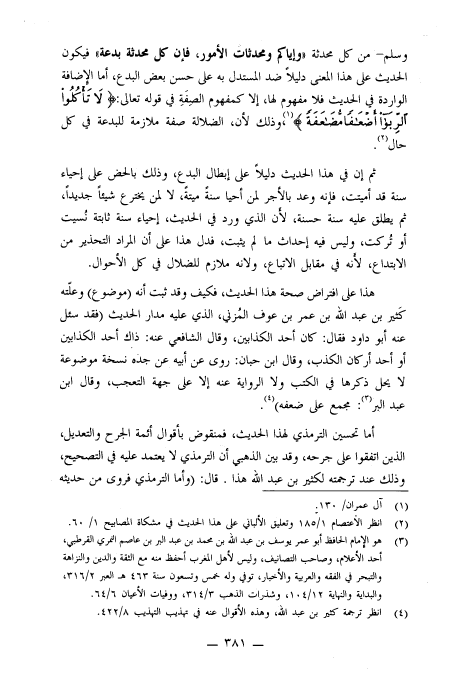 وسلم من كل محدثة "وإياكم ومحدثات الأمور، فإن كل محدثة بدعة " فيكون الحديث على هذا المعنى دليلاً ضد المستدل به على حسن بعض البدع، أما الإضافة الواردة في الحديث فلا مفهوم لها، إلا كمفهوم الصِفَةِ في قوله تعالى: {لاَ تَأْكُلُواْ الرّبَا أَضْعَافاً مّضَاعَفَةً} ، وذلك لأن، الضلالة صفة ملازمة للبدعة في كل حال.