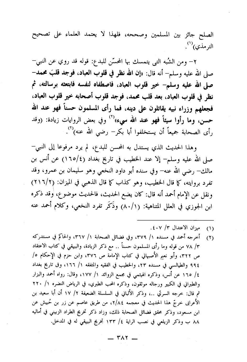 2- ومن الشُبه التي يتمسك بها المحسّن للبدع: قوله قد روي عن النبي صلى الله عليه وسلم أنه قال: " إن الله نظر في قلوب العباد، فوجد قلبَ محمد صلى الله عليه وسلم خير قلوب العباد، فاصطفاه لنفسه فابتعثه برسالته، ثم نظر في قلوب العباد، بعد قلب محمد، فوحد قلوب أصحابه خير قلوب العباد، فجعلهم وزراء نبيه يقاتلون على دينه، فما رأى المسلمون حسناً فهو عند الله حسن، وما رأوا سيئاً فهو عند الله سيء" وفي بعض الروايات زيادة: (وقد رأى الصحابة جميعاً أن يستخلفوا أبا بكر \رضي الله عنه) .