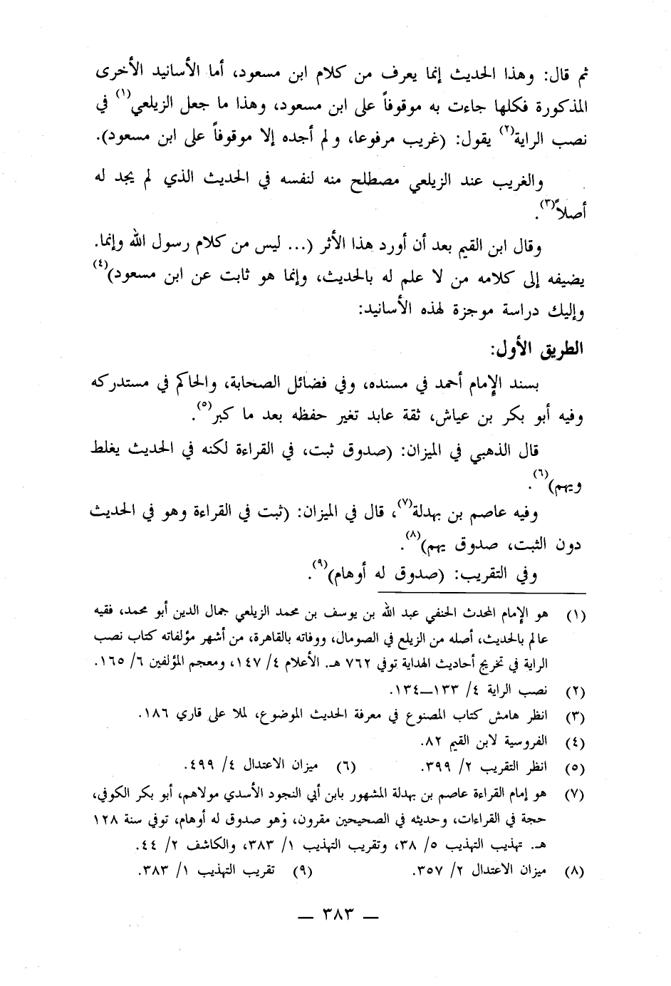 ثم قال: وهذا الحديث إنما يعرف من كلام ابن مسعود، أما الأسانيد الأخرى المذكورة فكلها جاءت به موقوفاً على ابن مسعود، وهذا ما جعل الزيلعي في نصب الراية يقول: (غريب مرفوعاً ولم أحده إلا موقوفاً على ابن مسعود) .