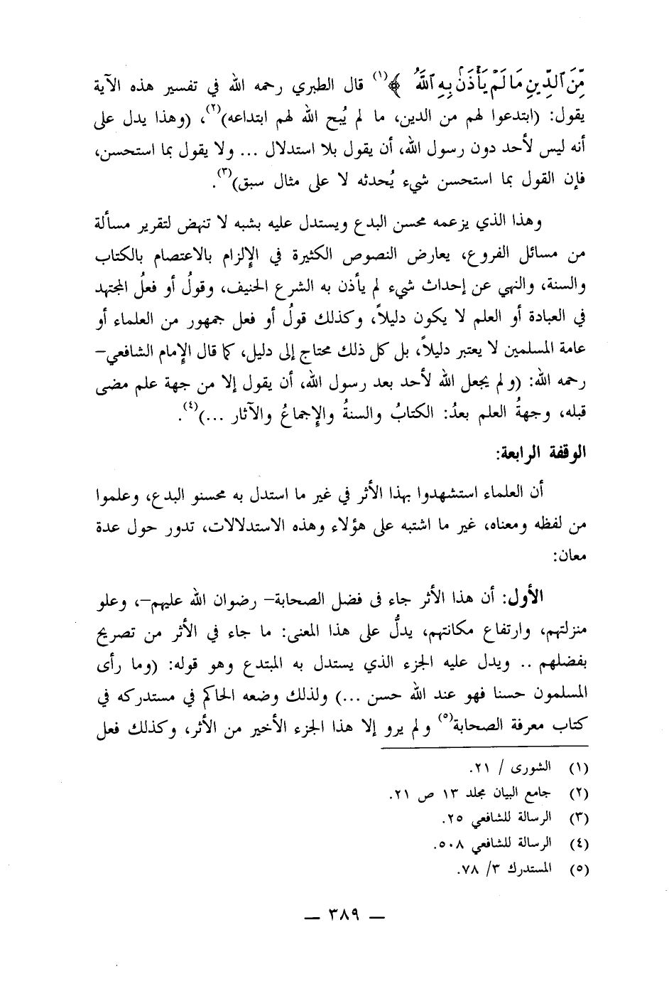 وهذا الذي يزعمه محسن البدع ويستدل عليه بشبه لا تنهض لتقرير مسألة من مسائل الفروع، يعارض النصوص الكثيرة في الإلزام بالاعتصام بالكتاب والسنة، والنهي عن إحداث شيء لم يأذن به الشرع الحنيف، وقولُ أو فعلُ المجتهد في العبادة أو العلم لا يكون دليلاً، وكذلك محتاج إلى دليل، كما قال الإمام الشافعي رحمه الله: (ولم يجعل الله لأحد بعد رسول الله، أن يقول إلا من جهة علم مضى قبله، وجهةُ العلم بعدُ: الكتابُ والسنةُ والإجماع ُ والآثار ... ) .