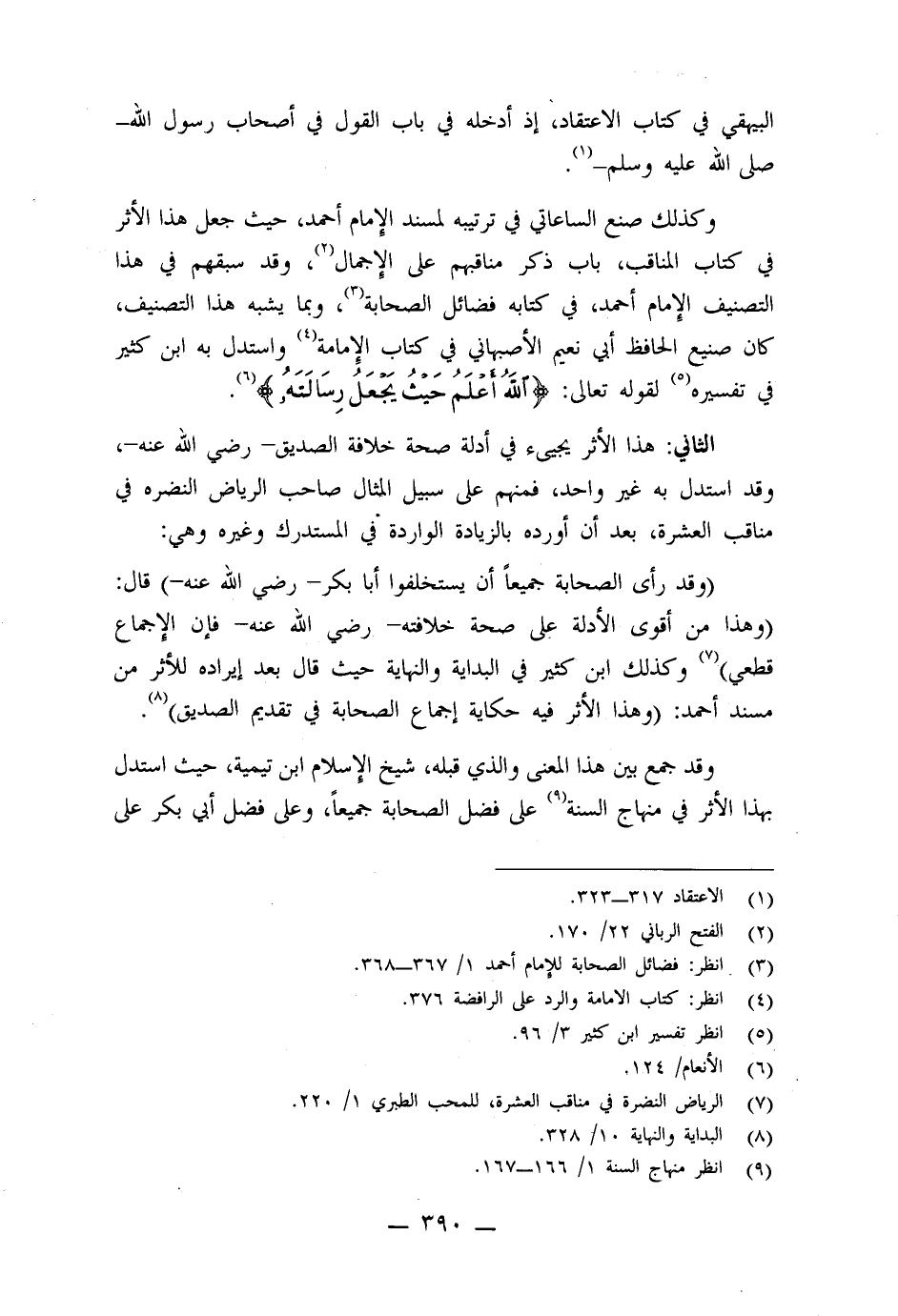 (وقد رأي الصحابة جميعاً أن يستخلفوا أبا بكر رضي الله عنه) قال: (وهذا من أقوى الأدلة على صحة خلافته رضي الله عنه فإن الإجماع قطعي) وكذلك ابن كثير في البداية والنهاية حيث قال بعد إيراده للأثر من مسند أحمد: (وهذا الأثر فيه حكاية إجماع الصحابة في تقديم الصديق) .