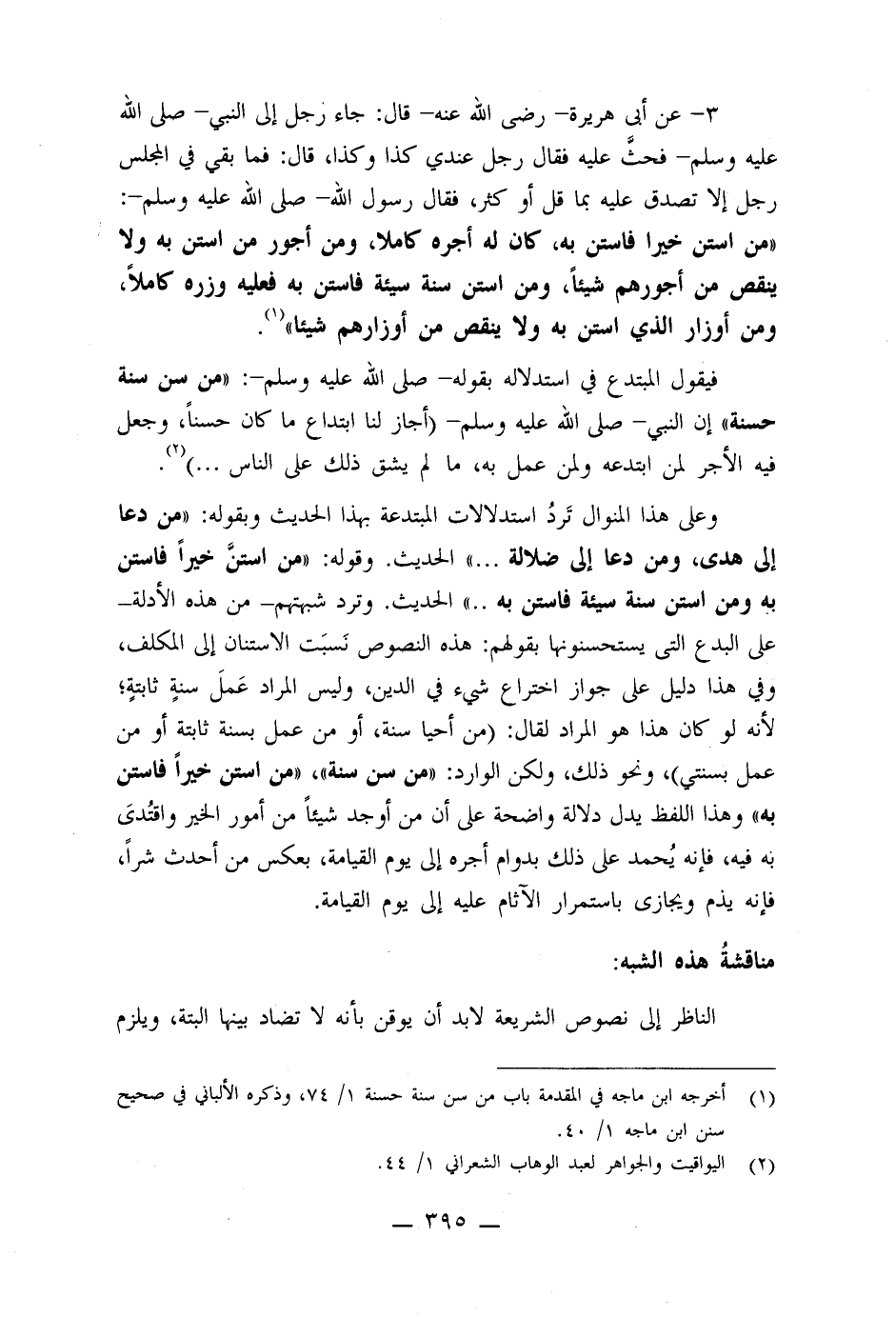 وعلى هذا المنوال تَردُ استدلالات المبتدعة بهذا الحديث وبقوله: " من دعا إلى هدى، ومن دعا إلى ضلالة ... " وقوله: " من استنَّ خيراً فاستن به ومن استن سنة سيئة فاستن به.. " الحديث. وترد شبهتهم ـ من هذه الأدلة ـ على البدع التي يستحسنونها بقولهم: هذه النصوص نَسَبت الاستننان إلى المكلف، وفي هذه دليل على جواز اختراع شيء في الدين، ولي المراد عَملَ سنةٍ ثابتةٍ، لأنه لو كان هذا هو المراد لقال: (من أحيا سنة، أو من عمل بسنة ثابتةٍ أو من عمل بسنتي) ، ونحو ذلك، ولكن الوارد: " من سن سنة "، " من استن خيراً فاستن به " وهذا اللفظ يدل دلالة واضحة على أن من أوجد شيئاً من أمور الخير واقتُدى به فيه، فإنه يُحمد على ذلك بدوام أجره إلى يوم القيامة، بعكس من أحدث شراً، فإنه يُذم ويجازى باستمرار الآثام عليه إلى يوم القيامة.