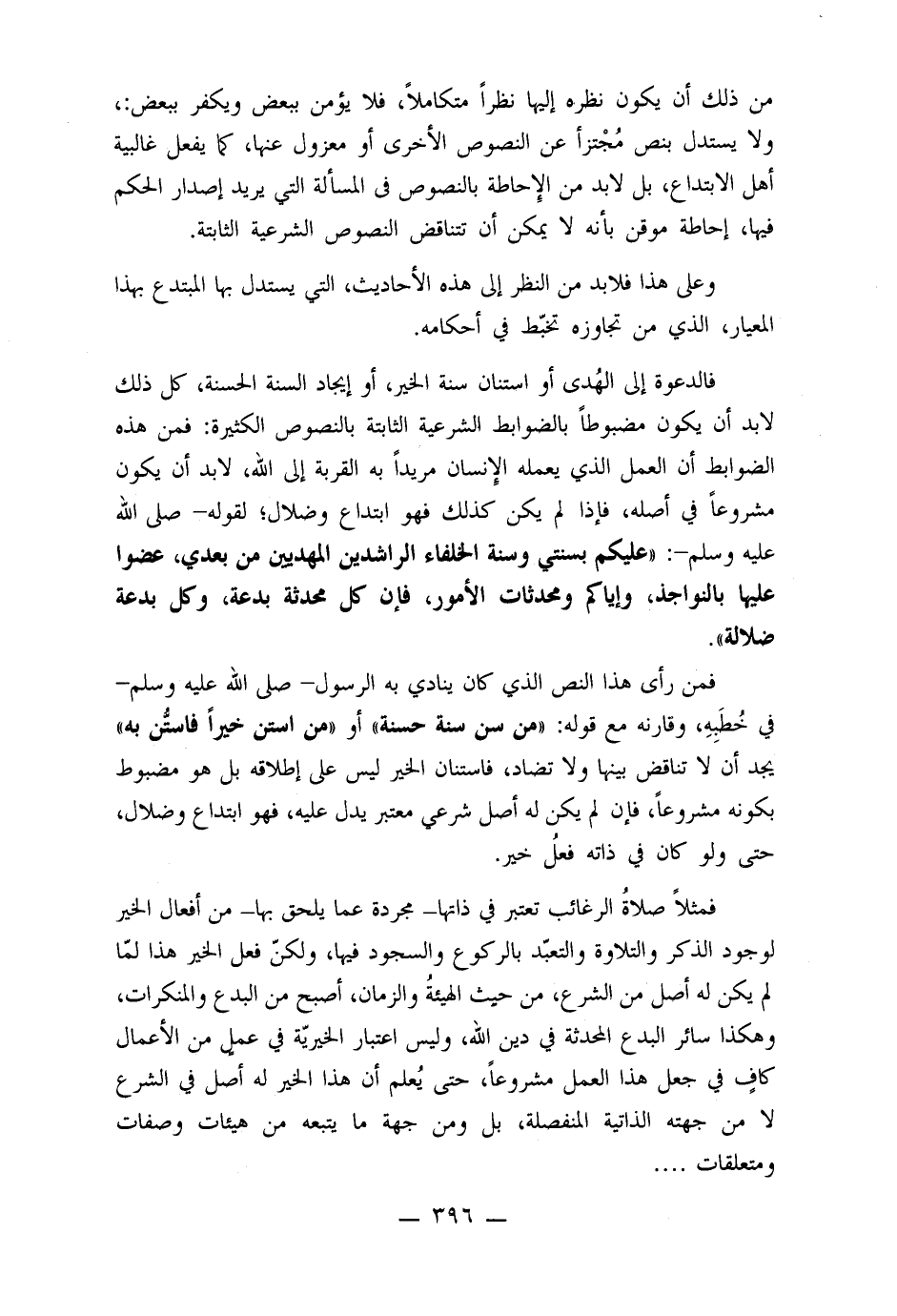فمن رأى هذا النص الذي كان ينادي به الرسول ـ صلى الله عليه وسلم ـ في خُطَبِهِ، وقارنه مع قوله: " من سن سنة حسنة" أو " من استن خيراً فاستُن به " يجد أن لا تناقض بينها ولا تضاد، فاستنان الخير ليس على إطلاقه بل هو مضبوط بكونه مشروعاً، فإن لم يكن له أصل شرعي معتبر يدل عليه، فهو ابتداع وضلال، حتى ولو كان في ذاته فعل خير.