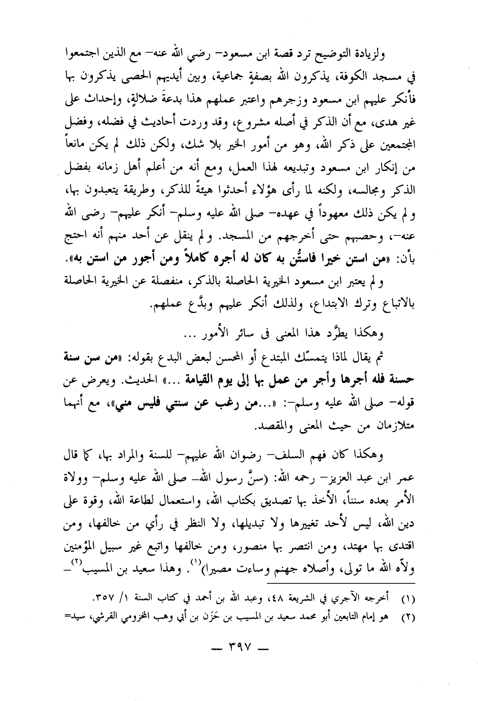 ولزيادة التوضيح ترد قصة ابن مسعود ـ رضي الله عنه ـ مع الذين اجتمعوا في مسجد الكوفة، يذكرون الله بصفةٍ جماعية، وبين أيديهم الصحى يذكرون بها فأنكر عليهم ابن مسعود وزجرهم واعتبر عملهم هذا بدعةَ ضلالةٍ، وإحداث على غير هدى، مع أن الذكر في اصله مشروع، وقد وردت أحاديث في فضله، وفضل المجتمعين على ذكر الله، وهو من أمور الخير بلا شك، ولكن ذلك لم يكن مانعاً من إنكار ابن مسعود وتبديعه لهذا العمل، ومع أنه من أعلم أهل زمانه بفضل الذكر ومجالسه، ولكنه لما رأى هؤلاء أحدثوا هيئةً للذكر، وطريقة يتعبدون بها، ولم يكن ذلك معهوداً في عهده ـ صلى الله عليه وسلم ـ أنكر عليهم ـ رضي الله عنه ـ، وحصبهم حتى أخرجهم من المسجد، ولم ينقل عن أحد منهم أنه احتج بأن: "من استن خيراً فاستُن به كان له أجره كاملاً ومن أجور من استن به".