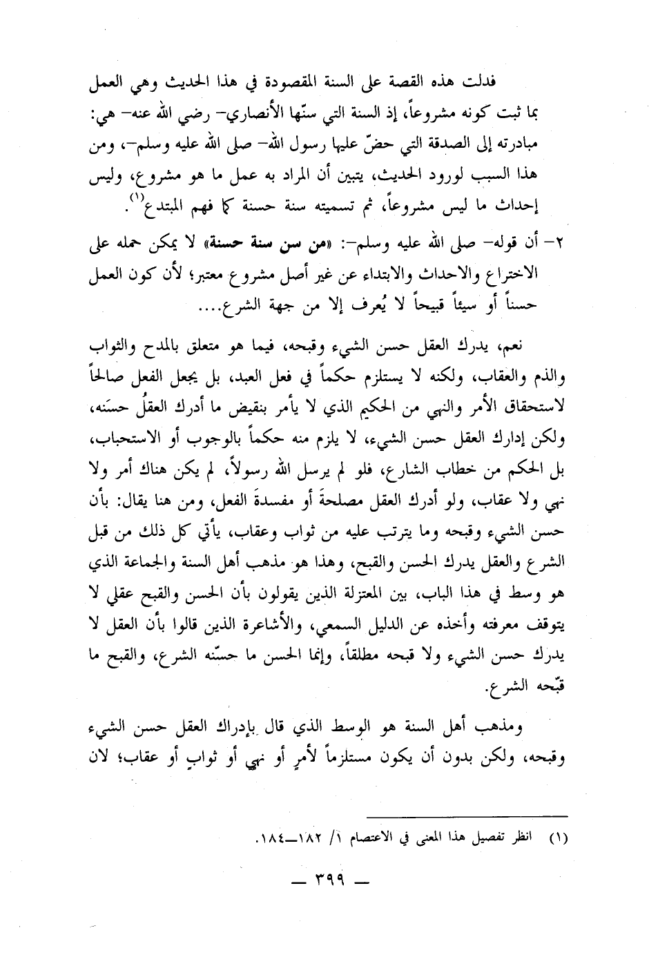 2- أن قوله ـ صلى الله عليه وسلم: " من سن سنة حسنة " لايمكن حمله على الاختراع والأحداث والابتداء عن غير أصل مشروع معتبر، لأن كون العمل حسناً أو سيئاً قبيحاً لا يُعرف إلامن جهة الشرع ...