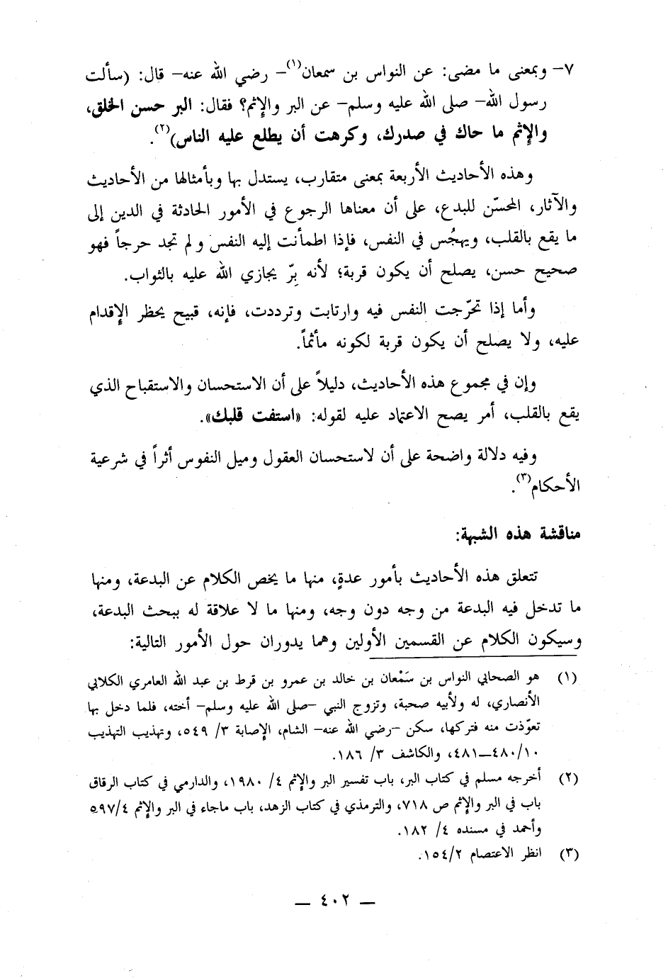 وهذه الأحاديث الأربعة بمعنى متقارب، يستدل بها وبأمثالها من الأحاديث والآثار، المحسّن للبدع، على أن معناها الرجوع في الأمور الحادثة في الدين إلى ما يقع بالقب، ويهجُس في النفس، فإذا اطمأنت إليه النفس ولم تجد حرجاً فهو صحيح حسن، يصلح أن يكون قربة، لأنه بِرّ يجازي الله عليه بالثواب.