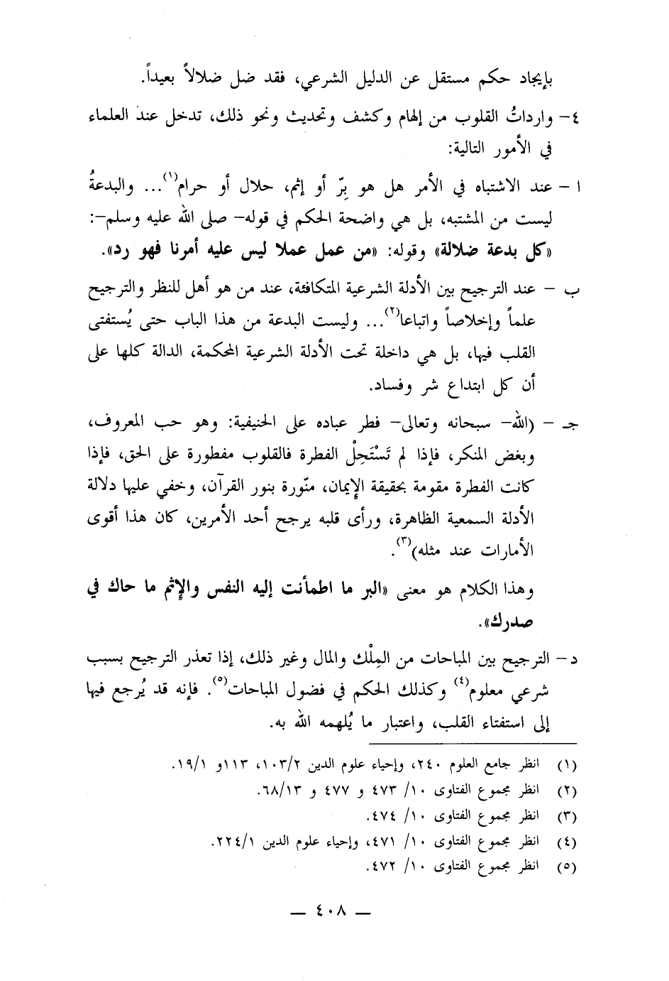 ب- عند الترجيح بين الأدلة الشرعية المتكافئة، عند من هو أهل للنظر والترجيح علماً وإخلاصاً واتباعاً ... ليست البدعة من هذا الباب حتى يُستفتي القلب فيها، بل هي داخلة تحت الأدلة الشرعية المحكمة، الدالة كلها على أن كل ابتداع شر وفساد.