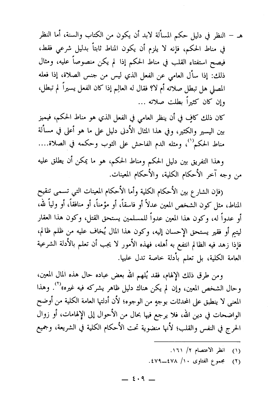 (فإن الشارع بين الأحكام الكلية وأما الأحكام المعينات التي تسمى تنقيح المناط، مثل كون الشخص المعين عدلاً أو فاسقاً، أو مؤمناً، أو منافقاً، أو ولياً لله، أو عدواً له، وكون هذا المعين عدواً للمسلمين يستحق القتل، وكون هذا العقار ليتيم أو فقير يستحق الإحسان إليه، وكون هذا المال يُخاف عليه من ظلم ظالم، فإذا زهد فيه الظالم انتفع به أهله، فهذه الأمور لا يجب أن تعلم بالأدلة الشرعية العامة الكلية، بل تعلم بأدلة خاصة تدل عليها.