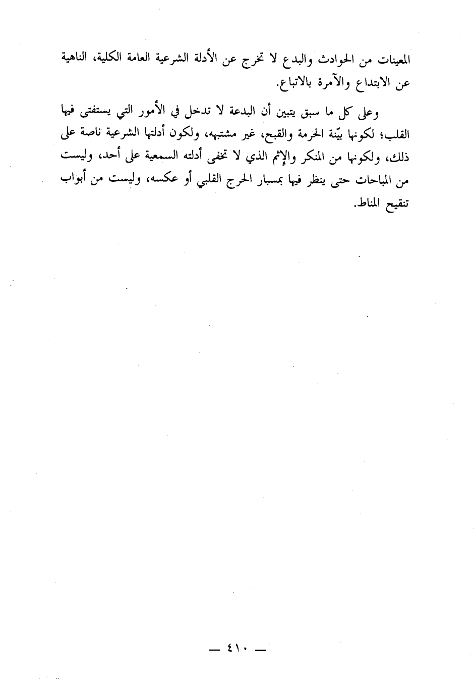 وعلى كل ما سبق يتبين أن البدعة لا تدخل في الأمور التي يستفتى فيها القلب، لكونها بيّنة الحرمة والقبح، غير مشتبهة، ولكون أدلتها الشرعية ناصة على ذلك، ولكونها من المنكر والإثم الذي لا تخفى أدلته السمعية على أحد، وليست من المباحات حتى ينظر فيها بمسبار الحرج القلبي أو عكسه، وليست من أبواب تنقيح المناط.
