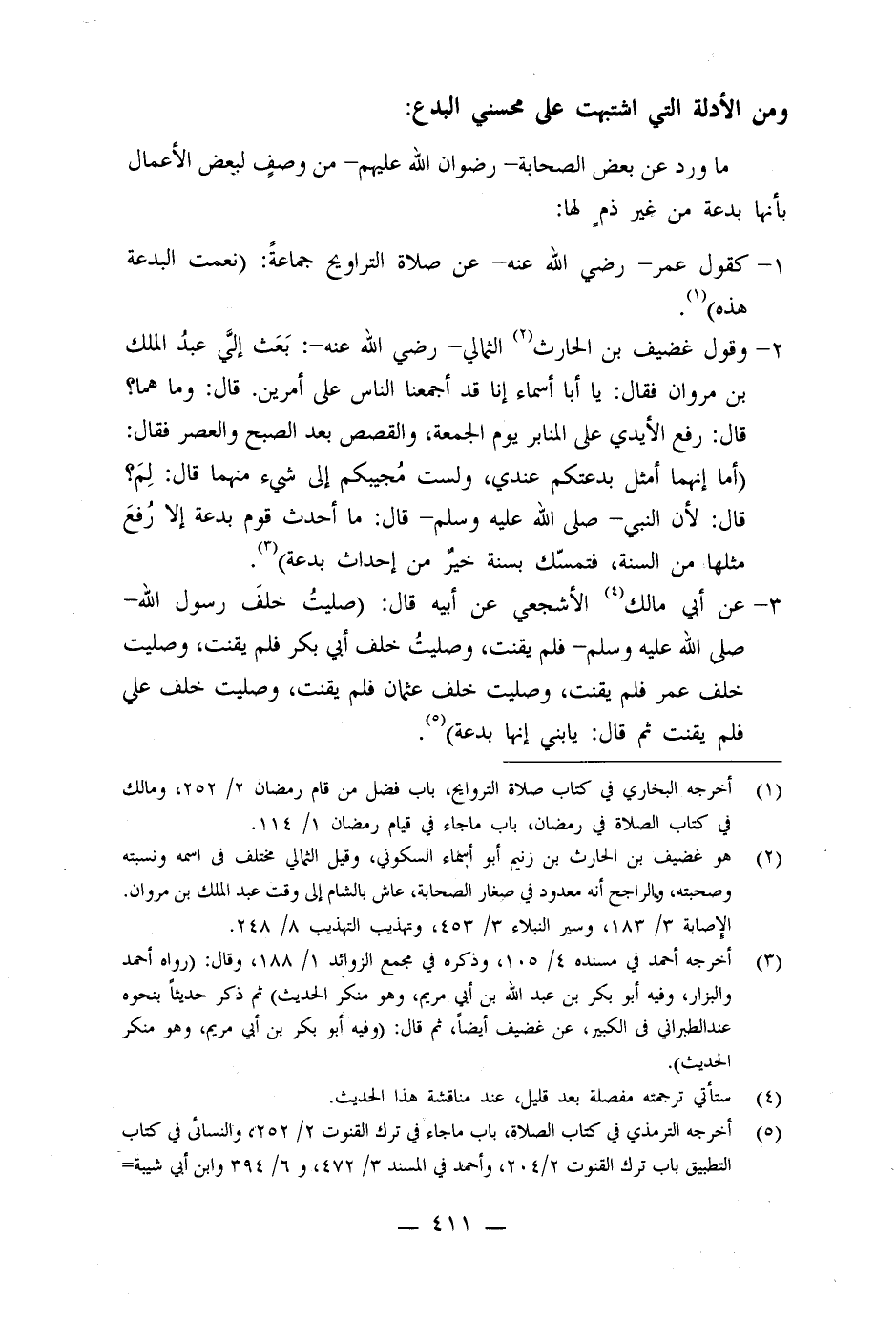 2- وقول غضيف بن الحارث الثمالي - رضي الله عنه -: (بعث إلي عبد الملك بن مروان فقال: يا أبا أسماء إنا قد أجمعنا الناس على أمرين، قال: وما هما؟ ، قال: رفع الأيدي على المنابر يوم الجمعة، والقصص بعد الصبح والعصر، فقال: أما إنهما أمثل بدعتكم عندي، ولست مجيبكم إلى شيء ٍ منهما، قال: ولم؟ ، قال: لأن النبي صلى الله عليه وسلم قال: ما أحدث قوم ٌ بدعة ً إلا رفع مثلها من السنة، فتمسكٌ بسنة ٍ خير ٌ من إحداث بدعة) .