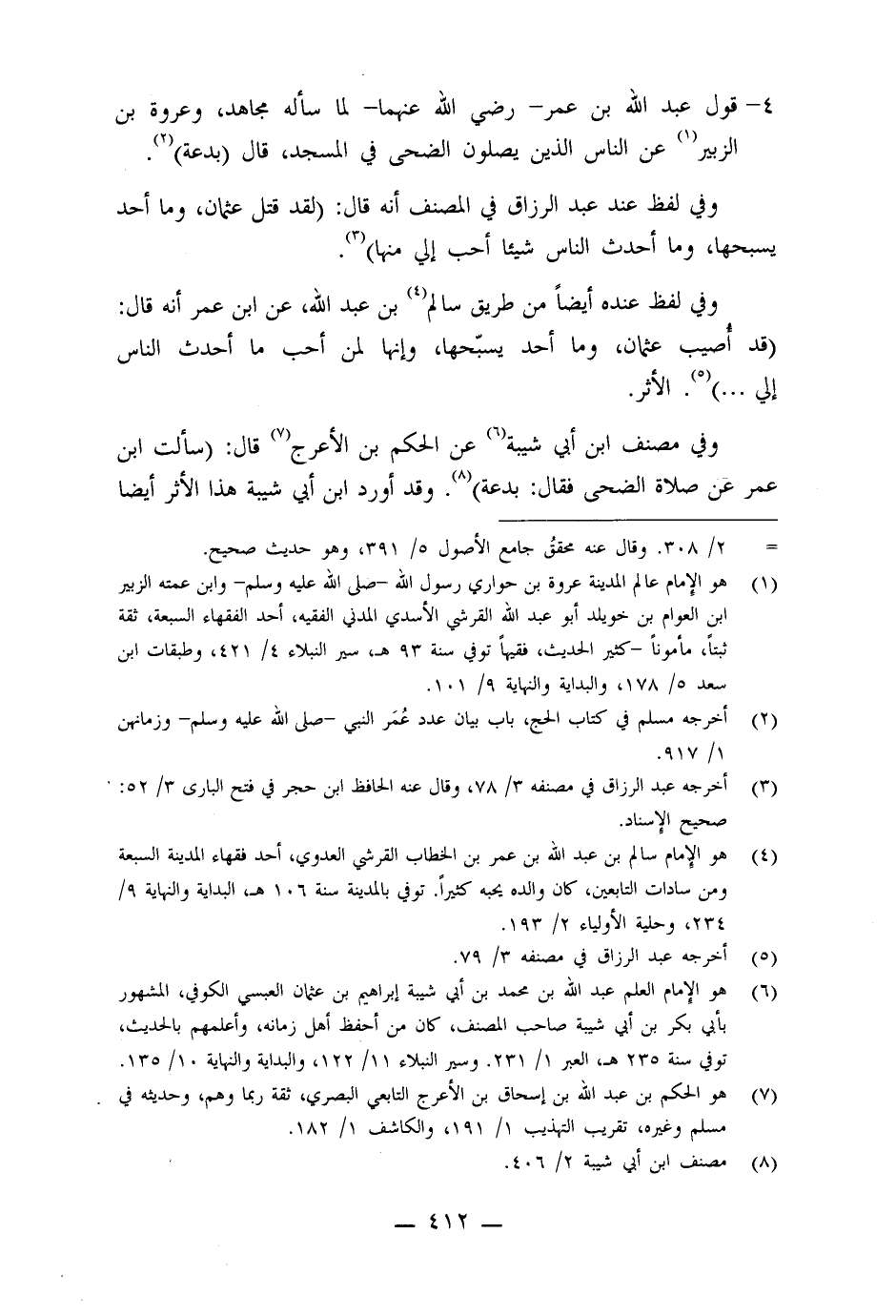 وفي مصنف ابن أبي شيبة عن الحكم بن الأعرج قال: (سألت ابن عمر عن صلاة الضحى فقال: بدعة) ، وقد أورد ابن أبي شيبة هذا الأثر أيضا ً