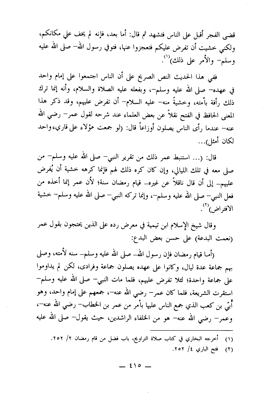 وقال شيخ الإسلام ابن تيمية في معرض رده على الذين يحتجون بقول عمر: (نعمت البدعة) على حسن بعض البدع: