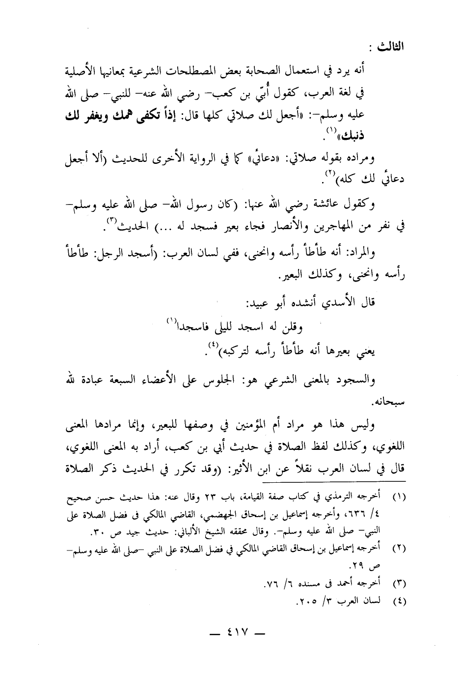 وليس هذا هو مراد أم المؤمنين في وصفها للبعير، وإنما مرادها المعنى اللغوي، وكذلك لفظ الصلاة في حديث أبي بن كعب رضي الله عنه أراد به المعنى اللغوي، قال في لسان العرب نقلا ً عن ابن الأثير: (وقد تكرر في الحديث ذكر الصلاة