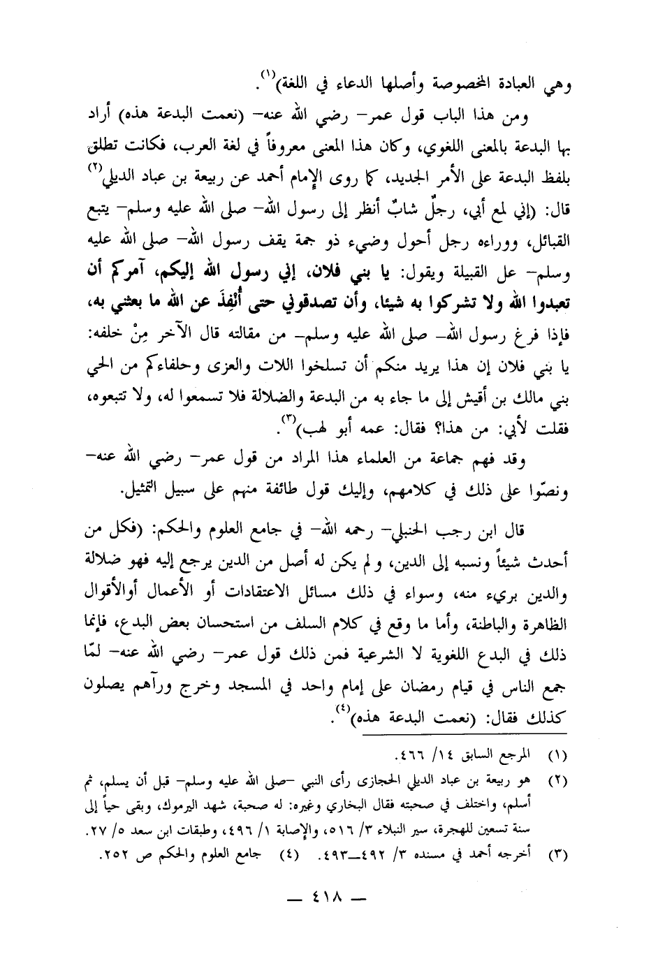 ومن هذا الباب قول عمر رضي الله عنه: (نعمت البدعة هذه) أراد بها البدعة بالمعنى اللغوي، وكان هذا المعنى معروفا ً في لغة العرب، فكانت تطلق لفظ البدعة على الأمر الجديد، كما روى الإمام أحمد عن ربيعة بن عباد الديلي قال: (إني لمع أبي، رجل ٌ شاب ٌ أنظر إلى رسول الله صلى الله عليه وسلم يتبع القبائل ووراءه رجل ٌ أحول وضيء ذو جمة ٍ يقف رسول الله صلى الله عليه وسلم على القبيلة يقول: يا بني فلان، إني رسول الله إليكم، آمركم أن تعبدوا الله ولا تشركوا به شيئا ً، وأن تصدقوني حتى أُنفِذَ عن الله ما بعثني به، فإذا فرغ رسول الله صلى الله عليه وسلم من مقالته قال الآخر من خلفه، يا بني فلان إن هذا يريد منكم أن تسلخوا اللات والعزى وحلفاءكم من الحي بني مالك بن أقيش إلى ما جاء به من البدعة والضلالة فلا تسمعوا له، ولا تتبعوه، فقلت لأبي من هذا؟ فقال: عمه أبو لهب) .