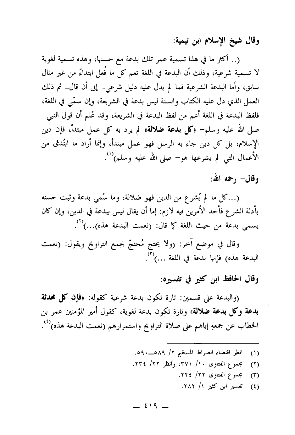 ( ... أكثر ما في هذا تسمية عمر تلك بدعة مع حسنها، وهذه تسمية لغوية لا تسمية شرعية، وذلك أن البدعة في اللغة تعم كل ما فُعل ابتداء ً من غير مثالٍ سابق ٍ، وأما البدعة الشرعية فما لم يدل عليه دليل شرعي - إلى أن قال - ثم ذلك العمل الذي دل عليه الكتاب والسنة ليس بدعة في الشريعة، وقد عُلم أن قول النبي صلى الله عليه وسلم لم يرد به كل عمل مبتدأ، فإن دين الإسلام بل كل دين جاء به الرسل فهو عمل مبتدأ، وإنما أراد ما ابتدئ من الأعمال التي لم يشرعها هو صلى الله عليه وسلم) .