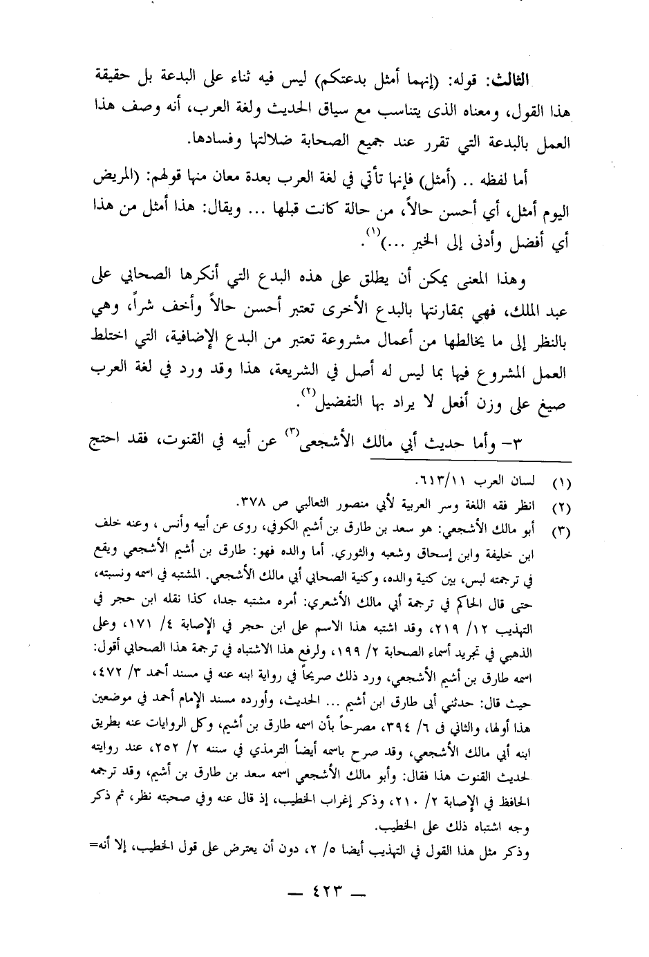 الثالث: قوله: (إنهما أمثل بدعتكم) ليس فيه ثناء على البدعة بل حقيقة هذا القول، ومعناه الذي يتناسب مع سياق الحديث ولغة العرب، أنه وصف هذا العمل بالبدعة التي تقرر عند جميع الصحابة ضلالتها وفسادها.