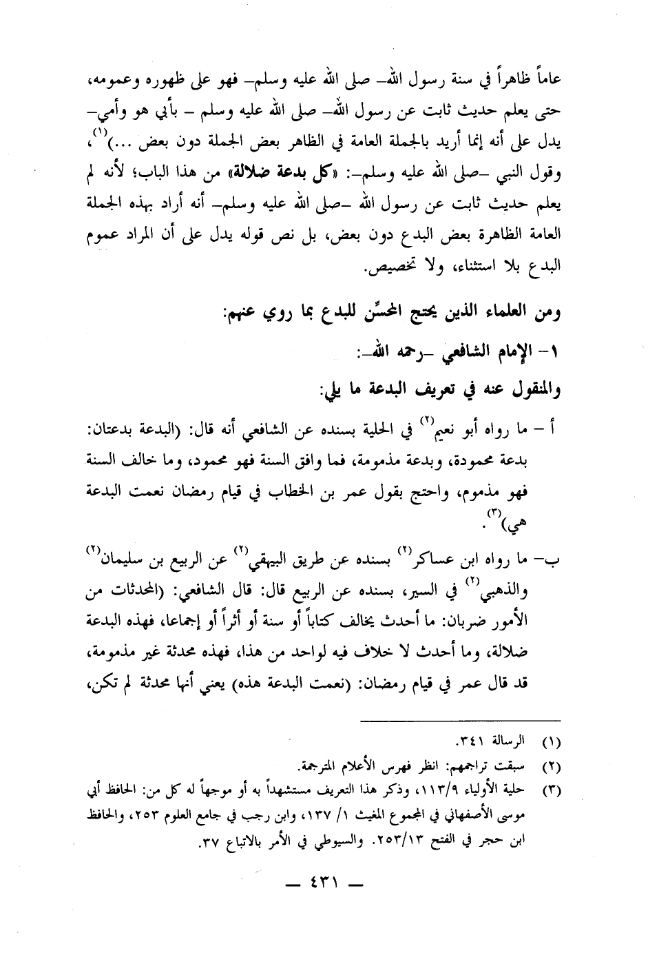 أ - ما رواه أبو نعيم في الحلية بسنده عن الشافعي أنه قال: (البدعة بدعتان: بدعة محمودة، وبدعة مذمومة، فما وافق السنة فهو محمود، وما خالف السنة فهو مذموم، واحتج بقول عمر بن الخطاب في قيام رمضان نعمت البدعة هي) .
