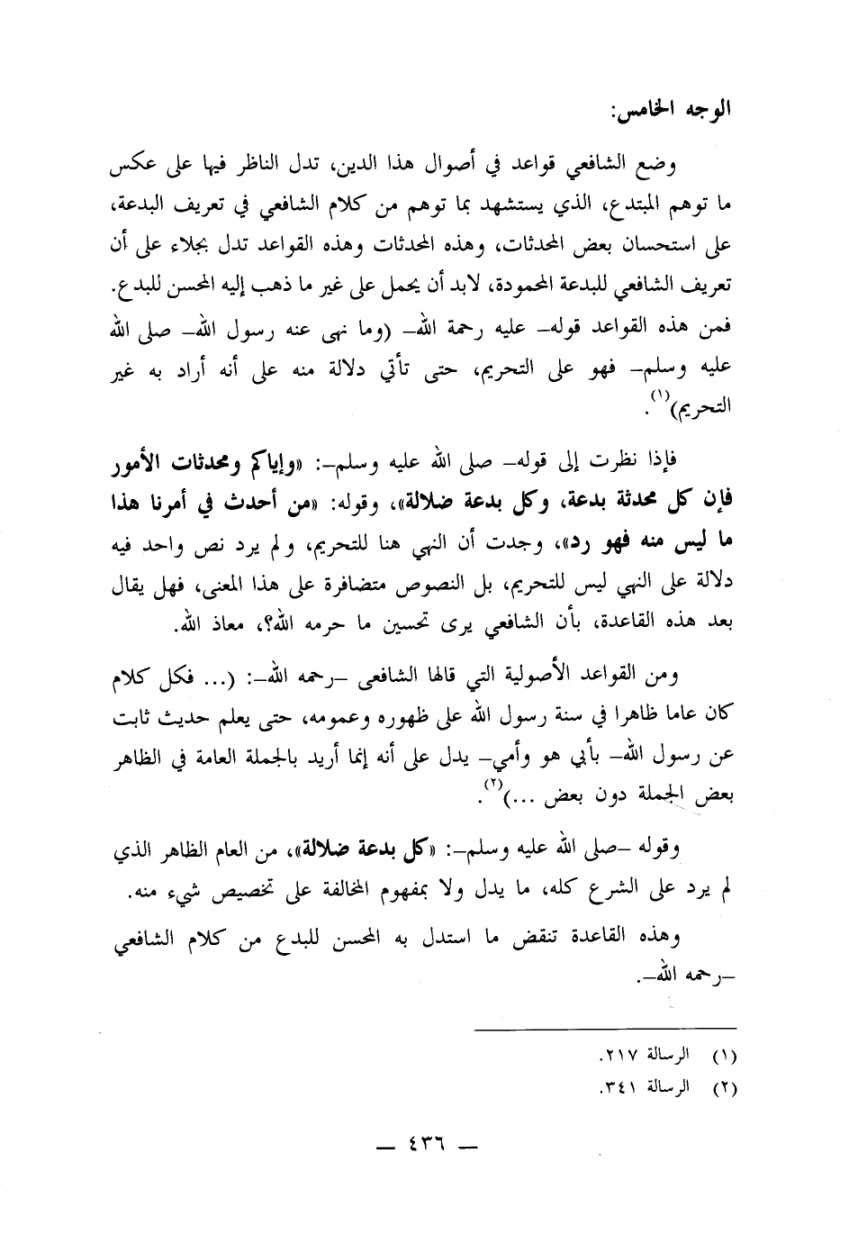 فإذا نظرت إلى قوله صلى الله عليه وسلم: " وإياكم ومحدثات الأمور فإن كل محدثة بدعة، وكل بدعة ضلالة "، وقوله: " من أحدث في أمرنا هذا ما ليس منه فهو رد "، وجدت أن النهي هنا للتحريم، ولم يرد نص واحد فيه دلالة على النهي ليس للتحريم، بل النصوص متضافرة على هذا المعنى، فهل يقال بعد هذه القاعدة، بأن الشافعي يرى تحسين ما حرمه الله؟ معاذ الله.