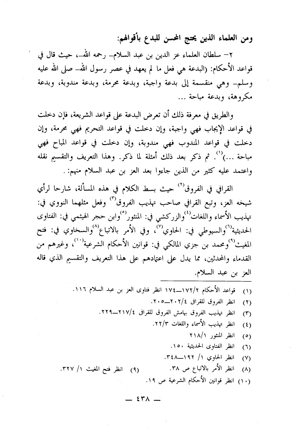 القرافي في الفروق حيث بسط الكلام في هذه المسألة، شارحاً لرأي شيخه العز، وتبع القوافي صاحب تهذيب الفروق وفعل مثلهما النووي في: تهذيب الأسماء واللغات والزركشي في: المنثور وابن حجر الهيثمي في: الفتاوى الحديثية والسيوطي في: الحاوي، وفي الأمر بالاتباع والسخاوي في: فتح المغيث ومحمد بن جزي المالكي في: قوانين الأحكام الشرعية، وغيرهم من القدماء والمحدثين، مما يدل على اعتمادهم على التعريف والتقسيم الذي قاله العز بن عبد السلام.