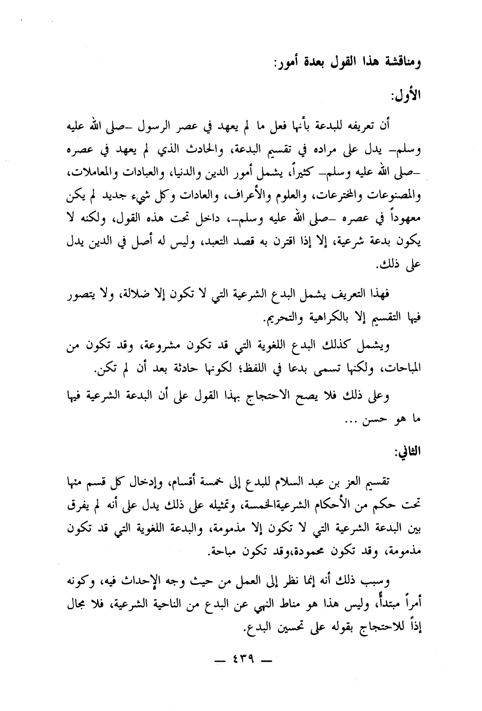 فهذا التعريف يشمل البدع الشرعية التي لا تكون إلا ضلالة، ولا يتصور فيها التقسيم إلا بالكراهية والتحريم. ويشمل كذلك البدع اللغوية التي قد تكون مشروعة، وقد تكون من المباحات، ولكنها تسمى بدعاً في اللفظ، لكونها حادثة بعد أن لم تكن. وعلى ذلك فلا يصح الاحتجاج بهذا القول على أن البدعة الشرعية فيها ما هو حسن ...