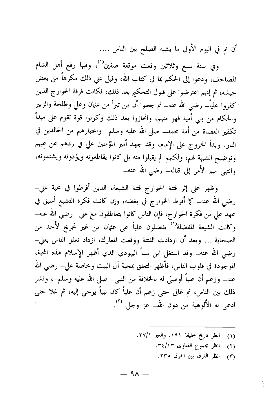 وفي سنة سبع وثلاثين وقعت موقعة صفين، وفيها رفع أهل الشام المصاحف، ودعوا إلى الحكم بما في كتاب الله، وقبل علي ذلك مكرهاً من بعض جيشه، ثم إنهم اعترضوا على قبول التحكيم بعد ذلك فكانت فرقة الخوارج الذين كفروا علياً - رضي الله عنه - ثم جعلوا أن من تبرأ من عثمان وعلي وطلحة والزبير والحكام من بني أمية فهو منهم، وانحازوا بعد ذلك وكونوا قوة تقوم على مبدأ تكفير العصاة من أمة محمد - صلى الله عليه وسلم - واعتبارهم من الخالدين في النار.